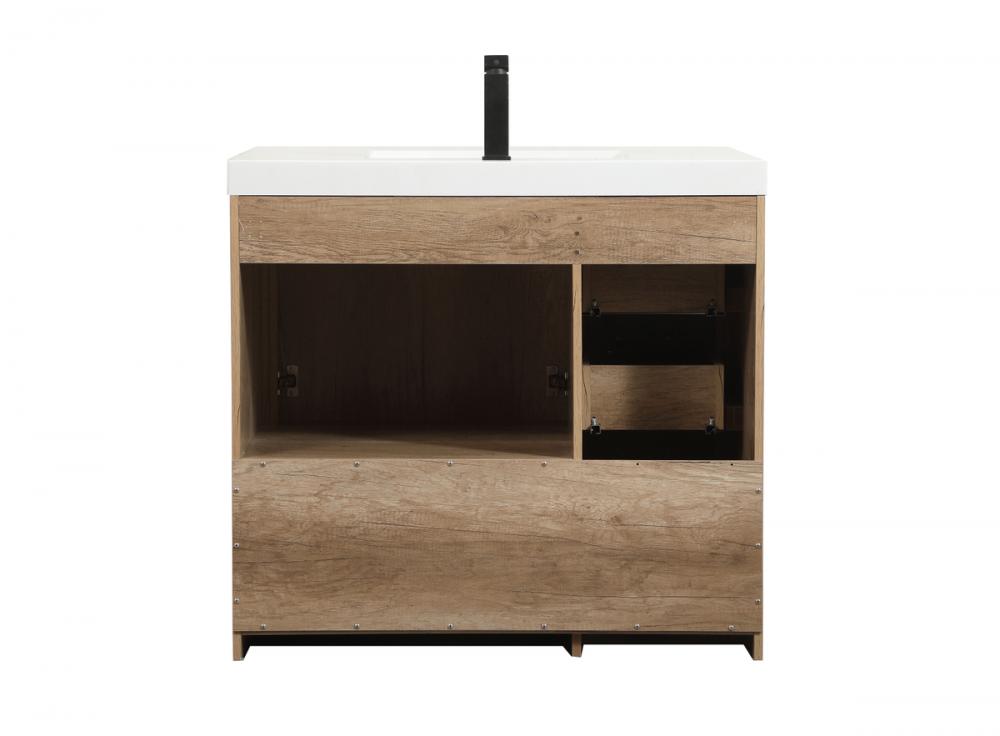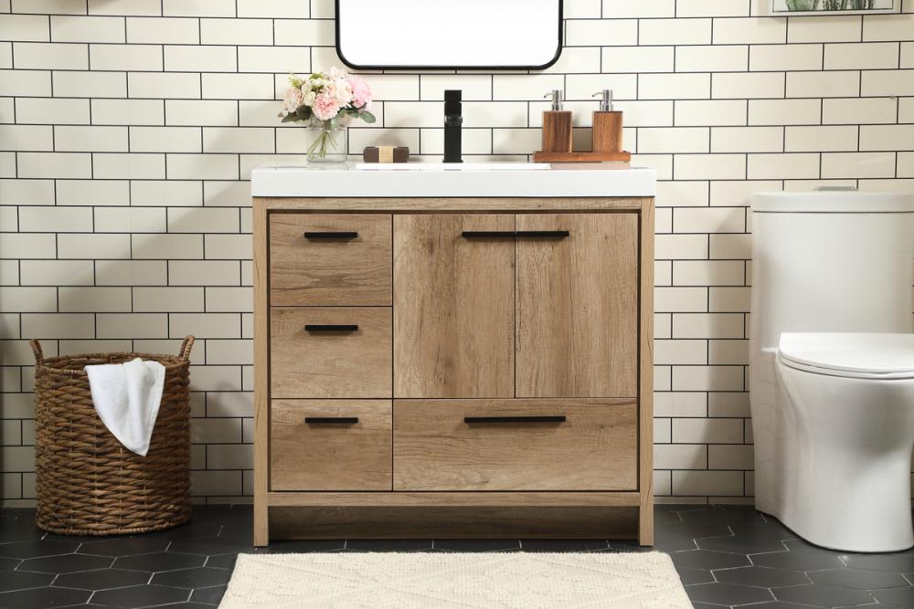 Modern sophistication is defined within the wood finish look and black barpulls of this vanity. Its length makes it the perfect addition to any sized home, and saves space with its storage area hidden behind the double cabinet doors and one bottom drawers. Topped with a highly durable thick resin white counter top and an integrated sink, this modern design will add everlasting class to your bathroom and powder room.