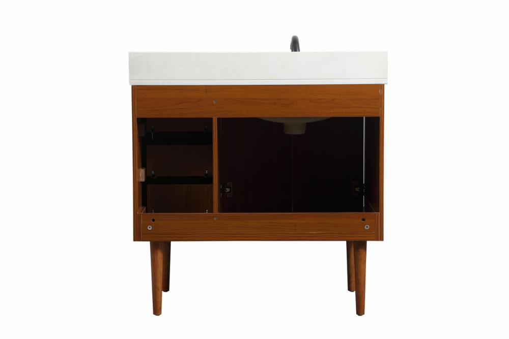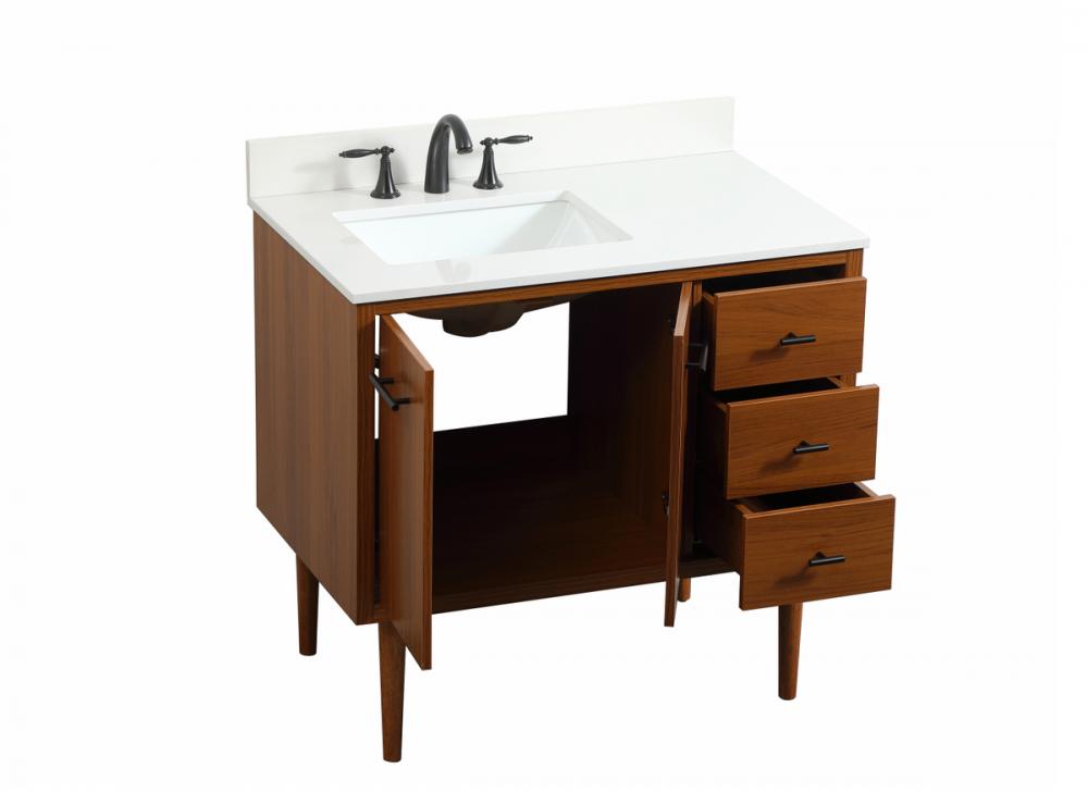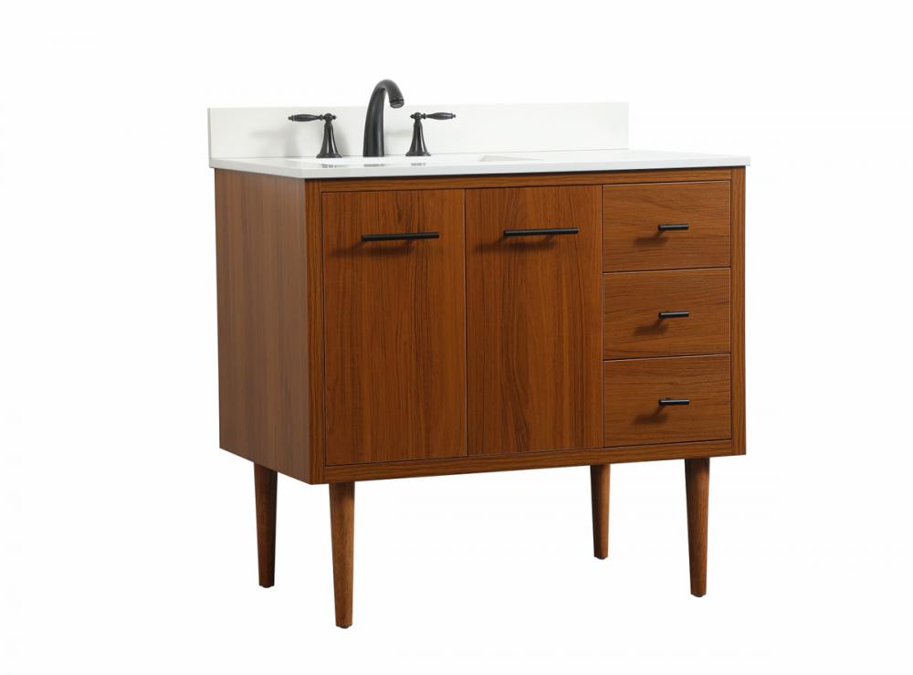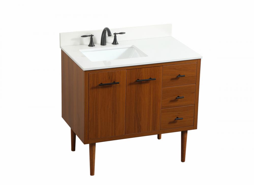 Delve into a world of minimalistic fashion and contemporary styling with this midcentury modern vanity. The clean lines anchors the design, while the straight tapered cylinder legs add subtle interest. Bar pull handle adorns the soft closing door hiding the base of the rectangular porcelain sink and letting you store your bathroom necessities and toiletries. Three soft closing drawers add plenty of storage option. Whether you want to use this as a floating vanity or a freestanding vanity, the choice is yours. The durable ivory white engineered marble countertop complements the manufactured wood base vanity and is built to last. Comes with a matching backsplash to complete the look and protects your wall.