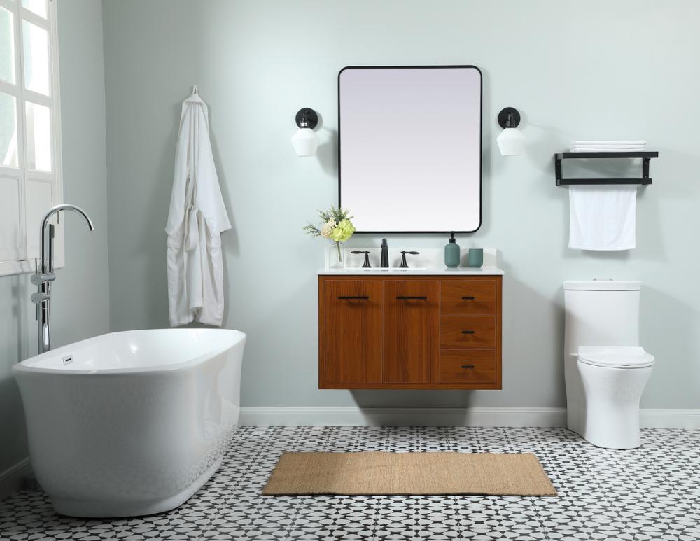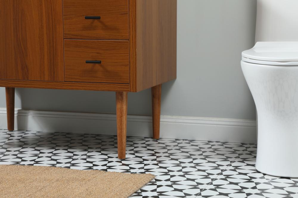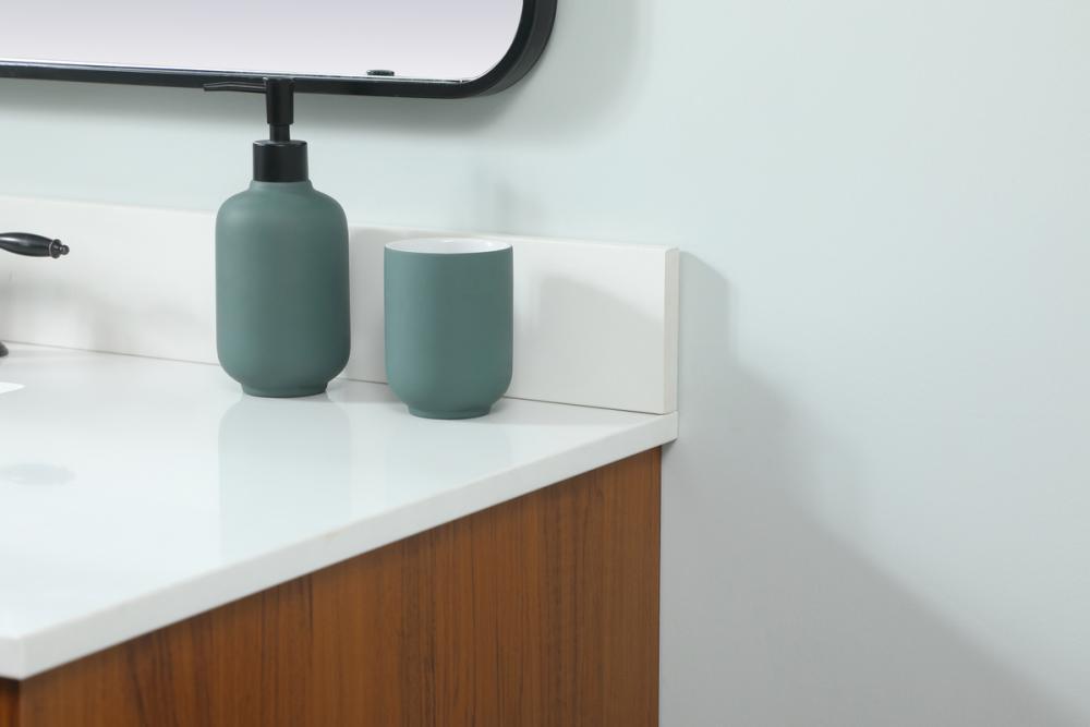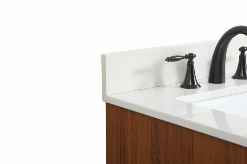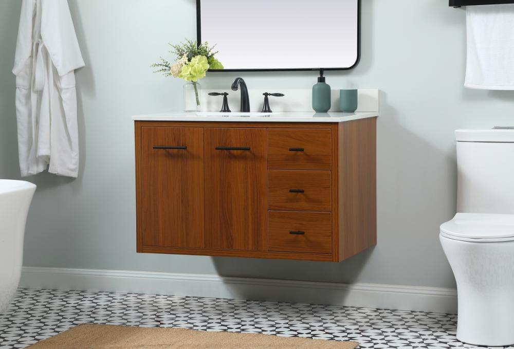 Delve into a world of minimalistic fashion and contemporary styling with this midcentury modern vanity. The clean lines anchors the design, while the straight tapered cylinder legs add subtle interest. Bar pull handle adorns the soft closing door hiding the base of the rectangular porcelain sink and letting you store your bathroom necessities and toiletries. Three soft closing drawers add plenty of storage option. Whether you want to use this as a floating vanity or a freestanding vanity, the choice is yours. The durable ivory white engineered marble countertop complements the manufactured wood base vanity and is built to last. Comes with a matching backsplash to complete the look and protects your wall.
