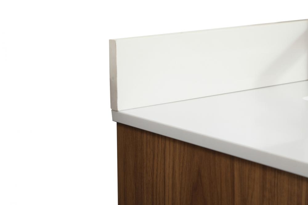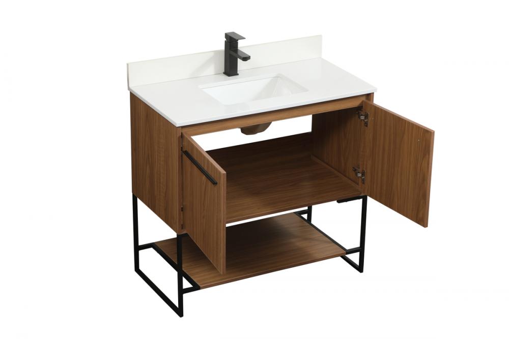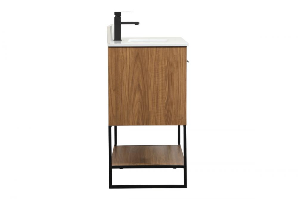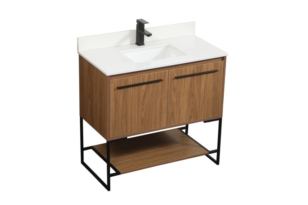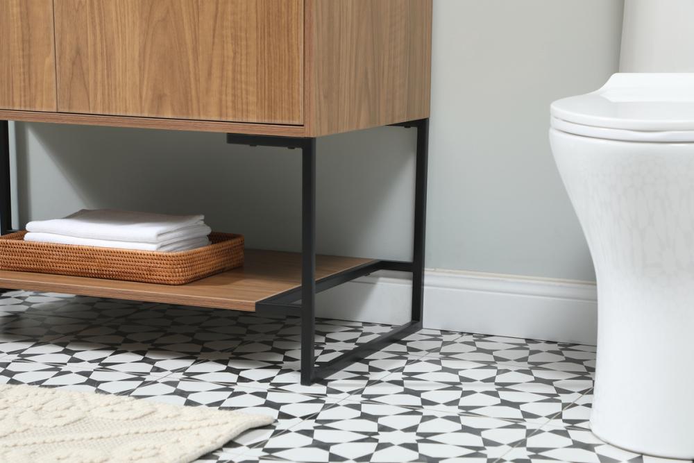 Live in comfort with this modern vanity. Dressed in a walnut brown and modern black metal hardware, its sleek style will have your bathroom or powder room elevated in industrial sophistication. The open shelf at the base and two doors reveal ample storage space for your bathroom essentials. Clean lines create its own visual interest, adding trendy looks to your already chic room. Comes with a matching backsplash to complete the look and protects your wall.