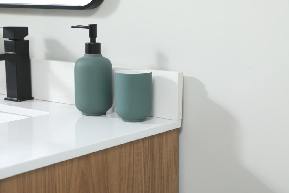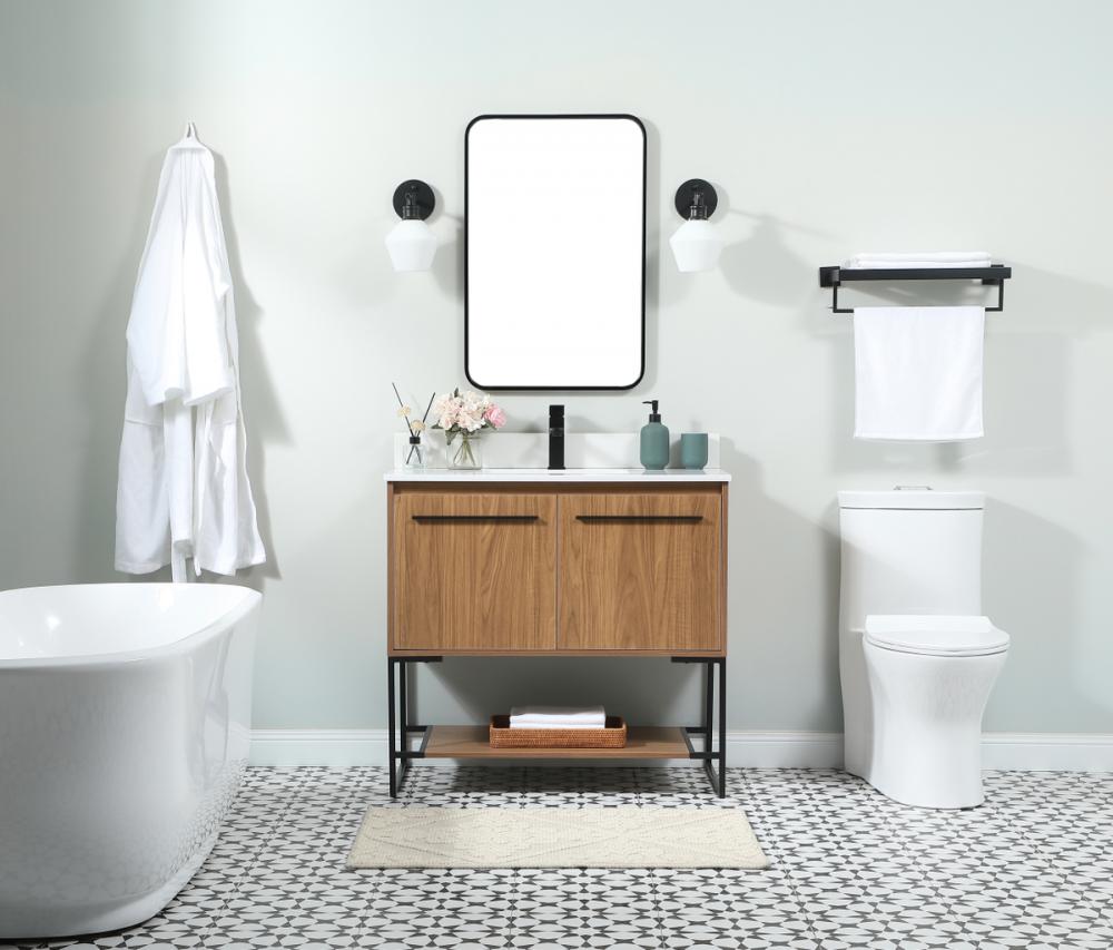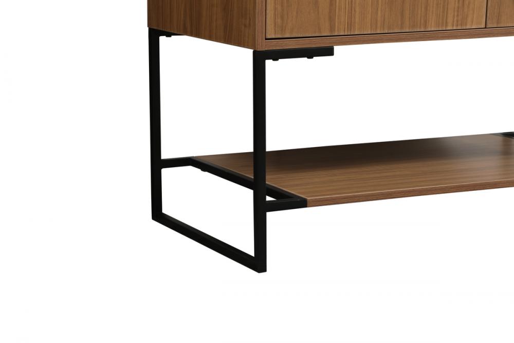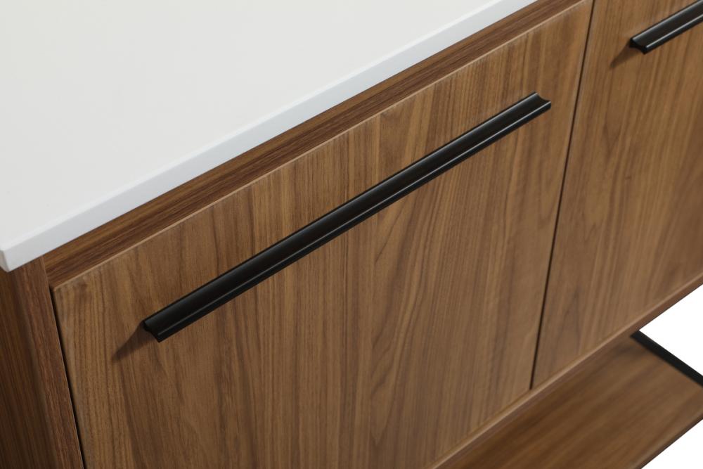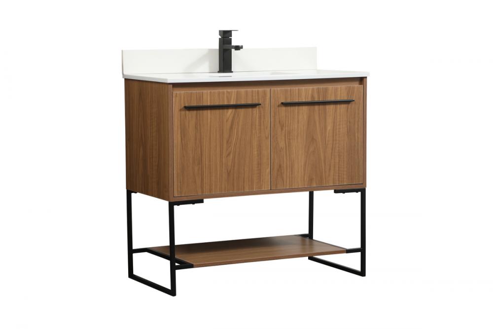 Live in comfort with this modern vanity. Dressed in a walnut brown and modern black metal hardware, its sleek style will have your bathroom or powder room elevated in industrial sophistication. The open shelf at the base and two doors reveal ample storage space for your bathroom essentials. Clean lines create its own visual interest, adding trendy looks to your already chic room. Comes with a matching backsplash to complete the look and protects your wall.