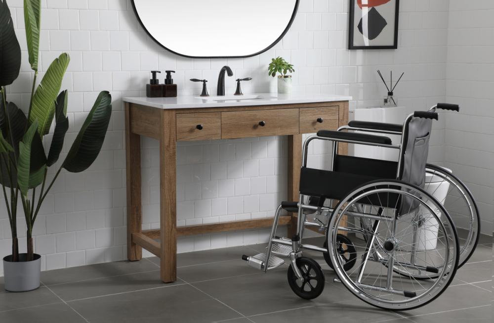 The sink vanity is thoughtfully crafted to accommodate wheelchair access, promoting inclusivity in your bathroom space.