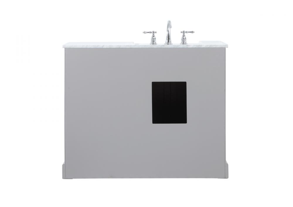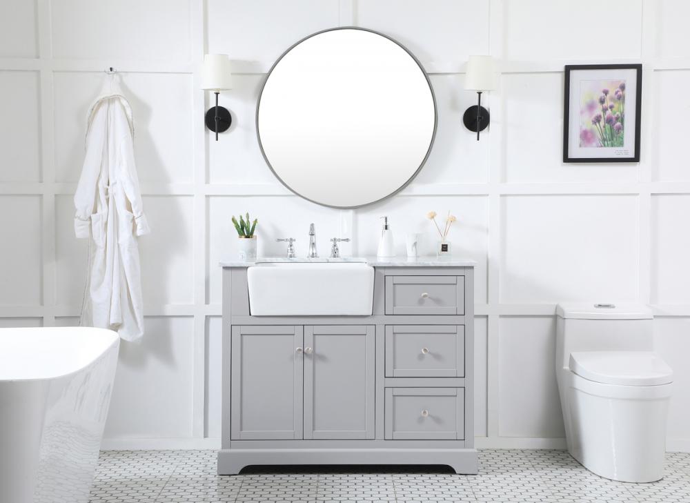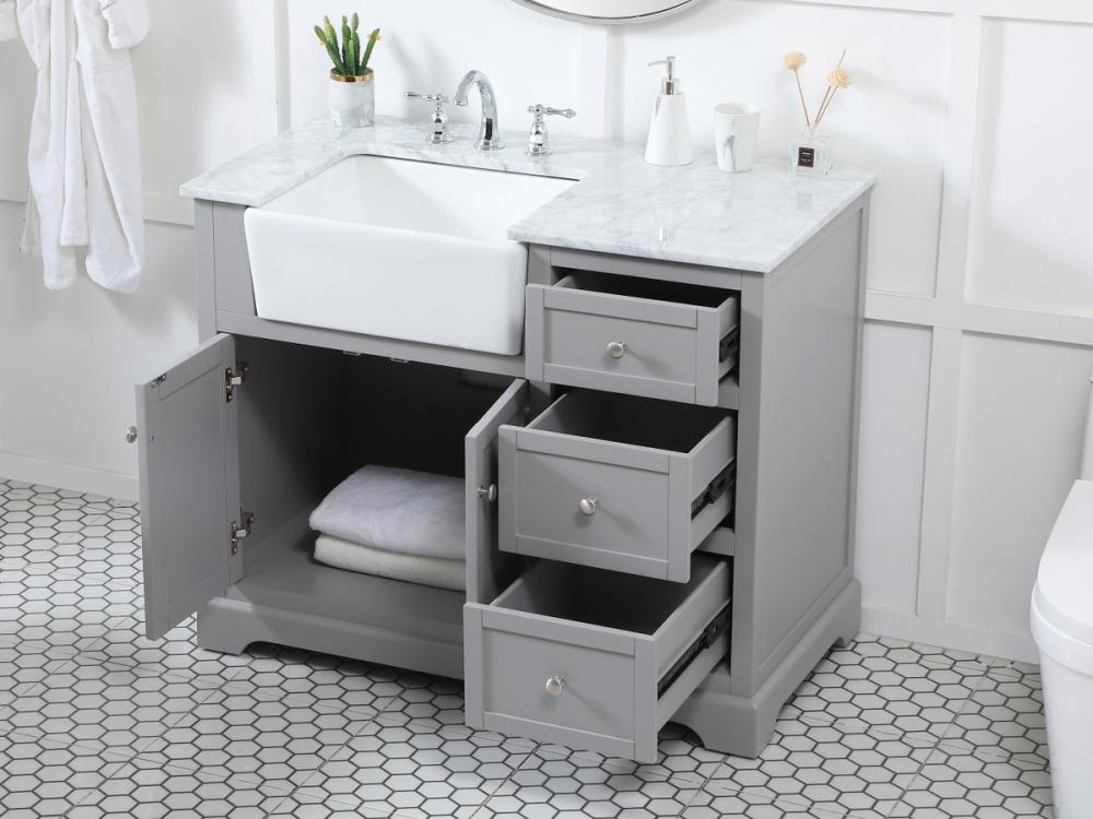 Make the most of your space with this farmhouse style bathroom vanity. Complements well with its beautiful finish, carrara white marble countertop, and the contemporary slender handle bar that sits on the functional drawers with soft closing mechanism, allowing you to store an assortment of bathroom essentials. The lower shelf makes it the perfect space to hold new towels for your guests. This stylish vanity ensures both form and function in your bathroom for you and your guests.