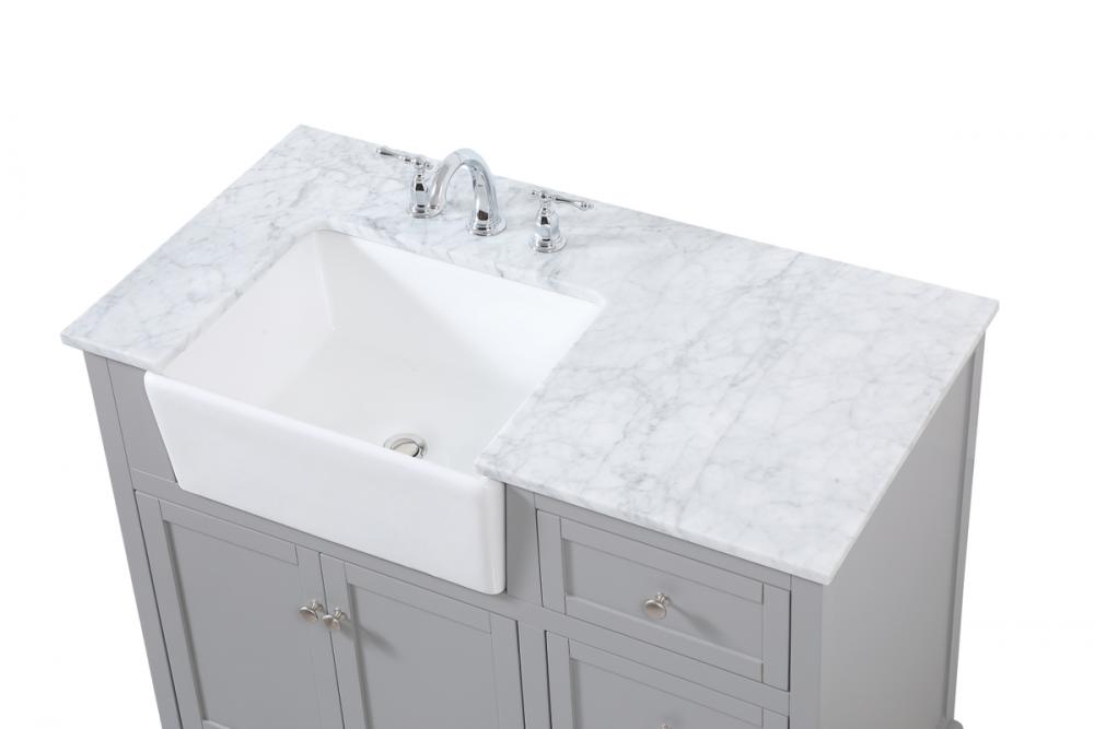 Comes with an apron porcelain sink and durable marble stone top in carrara white finish