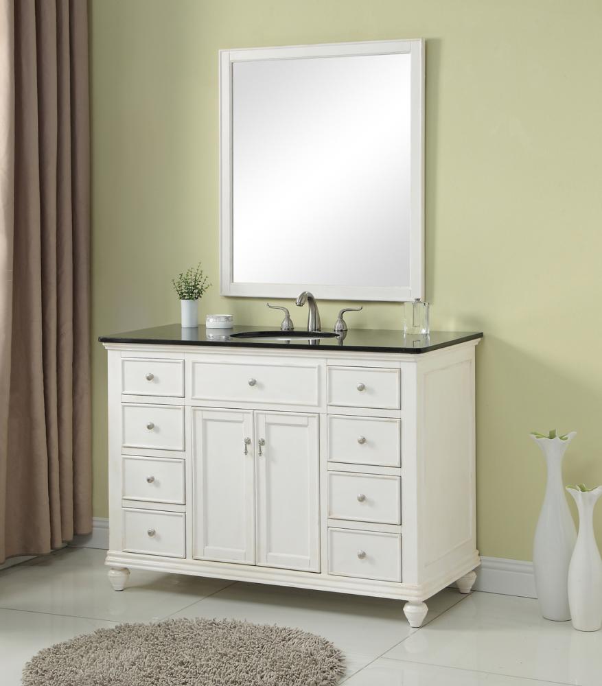A sleekly styled 4 doors and 8 drawers, granite-topped bathroom vanity like this can only bring a smile of appreciation for its simple beauty and clean lines. With an authentic black granite counter top, oval white porcelain sink, hand painted antique white cabinet, 2 soft-close center doors with a shelf inside, 4 side drawers on each side, brushed steel hardware and carved bun feet, this elegant, transitional vanity balances form and function. Measurements: W48”xD21”xH35”