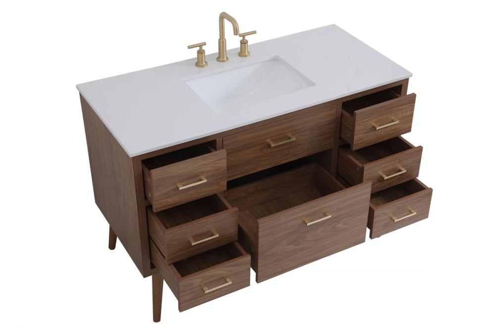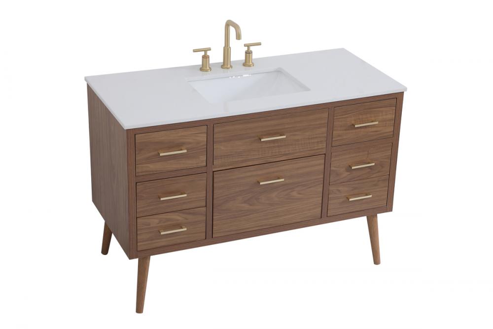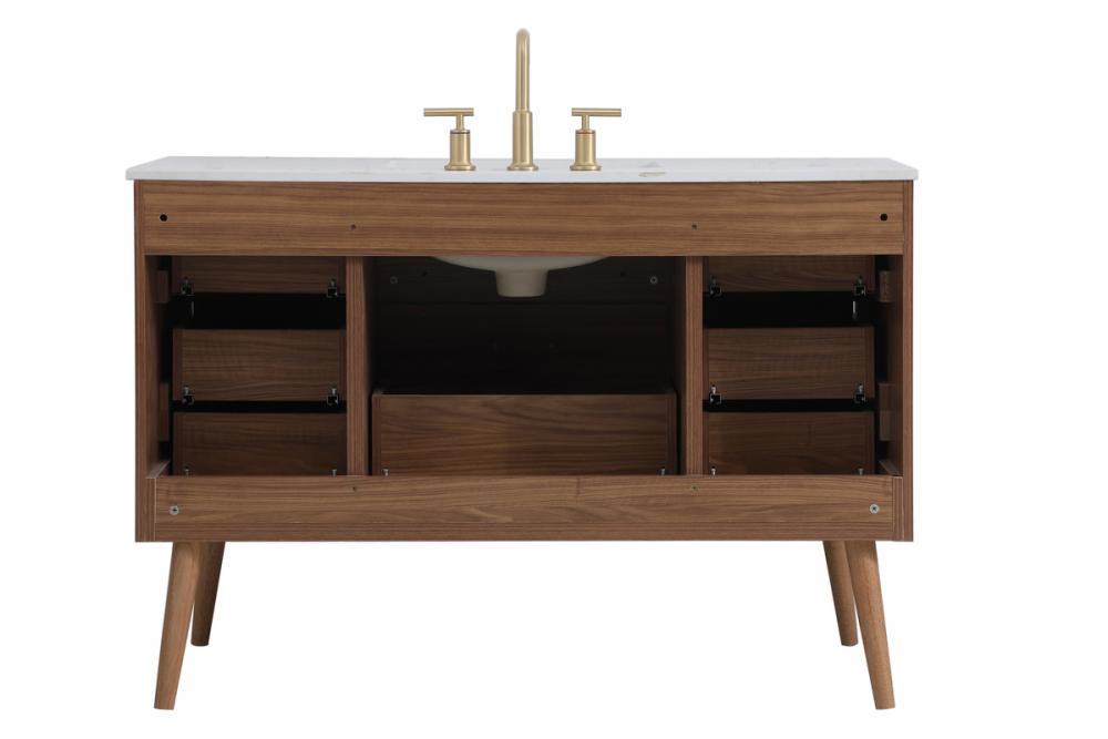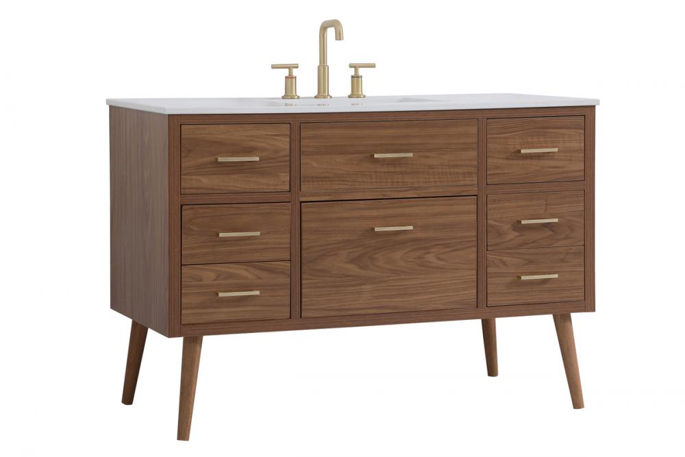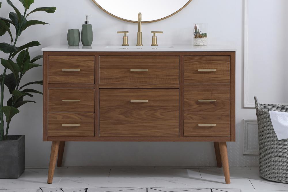 Delve into a world of minimalistic fashion and contemporary styling with this midcentury modern 48" vanity. The clean lines anchors the design, while the oblique tapered cylinder legs add subtle interest. However, the artful juxtaposition creates a blend of bright modernity and classical traditions. A gold handle adorns the top fake drawer hiding the base of the undermount porcelain sink while another one allows you to pull the bottom drawer out, letting you store your bathroom necessities and toiletries. The compact size makes it the perfect vanity for any bathroom or powder room, regardless of size.