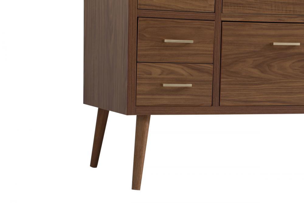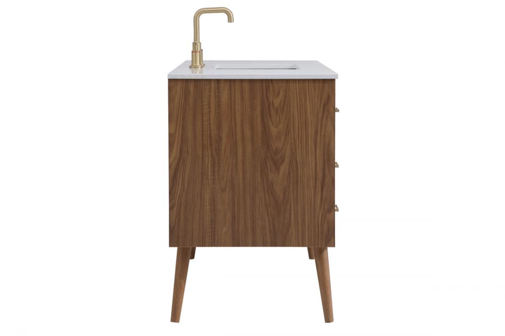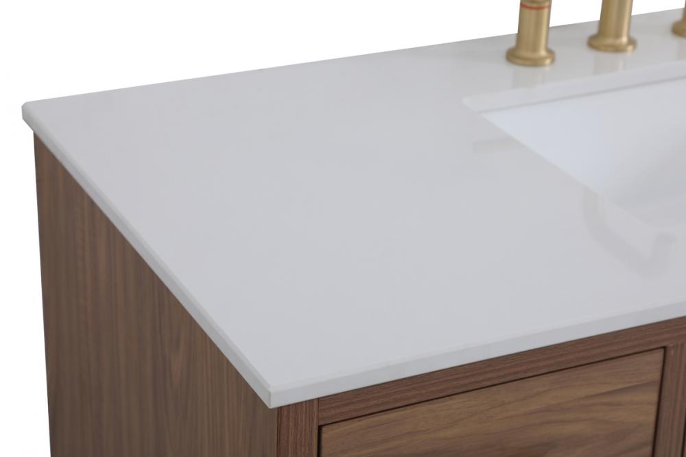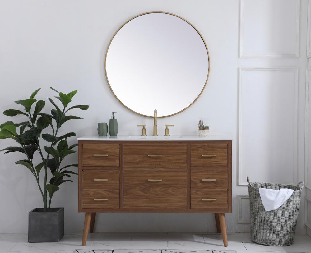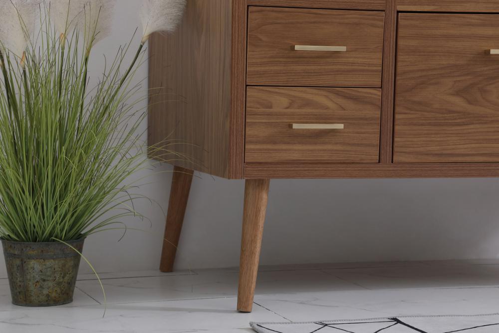 Delve into a world of minimalistic fashion and contemporary styling with this midcentury modern 48" vanity. The clean lines anchors the design, while the oblique tapered cylinder legs add subtle interest. However, the artful juxtaposition creates a blend of bright modernity and classical traditions. A gold handle adorns the top fake drawer hiding the base of the undermount porcelain sink while another one allows you to pull the bottom drawer out, letting you store your bathroom necessities and toiletries. The compact size makes it the perfect vanity for any bathroom or powder room, regardless of size.