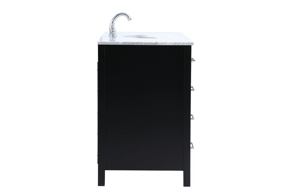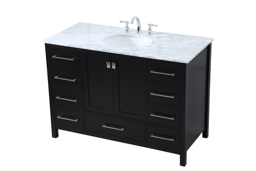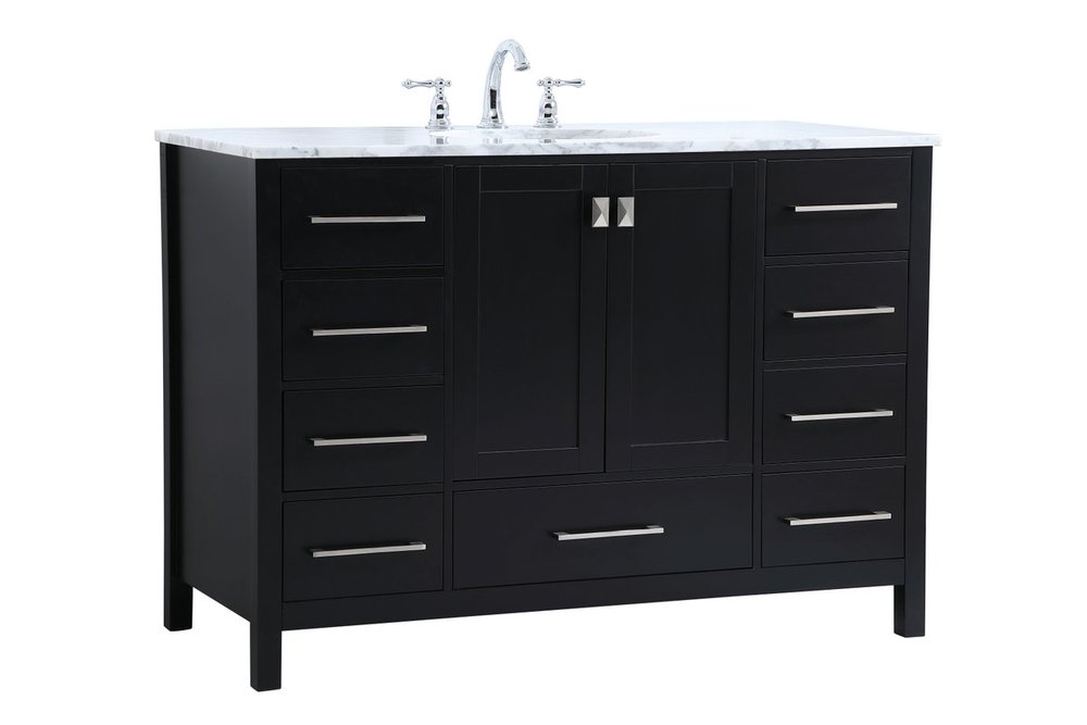 Never compromise beauty--the Erina collection stunning vanity in a black finish will add lovely sophistication and complement any bathroom or powder room, while utilizing its charm and function to provide you with ample storage spaces. Brushed nickel pulls gently adorn the minimalist cabinet doors and drawers at the base, allowing for you to store away your bathroom essentials. The Carrara white marble countertop, porcelain undermount sink, dignified subtle engravings on the side edges, and squared legs all come together to create contemporary beauty. Work with your space, and design a beautiful room, no matter the size.