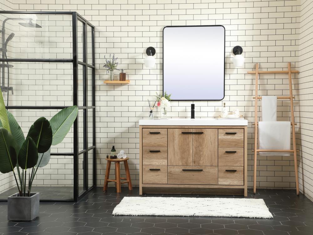 Modern sophistication is defined within the wood finish look and black barpulls of this vanity. Its length makes it the perfect addition to any sized home, and saves space with its storage area hidden behind the double cabinet doors and one bottom drawers. Topped with a highly durable thick resin white counter top and an integrated sink, this modern design will add everlasting class to your bathroom and powder room.