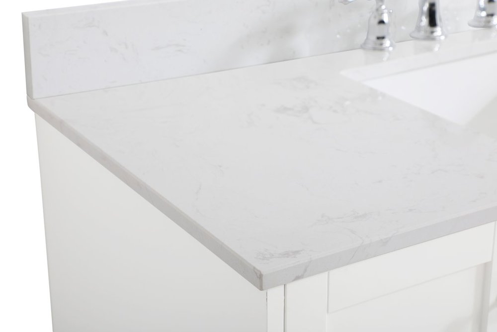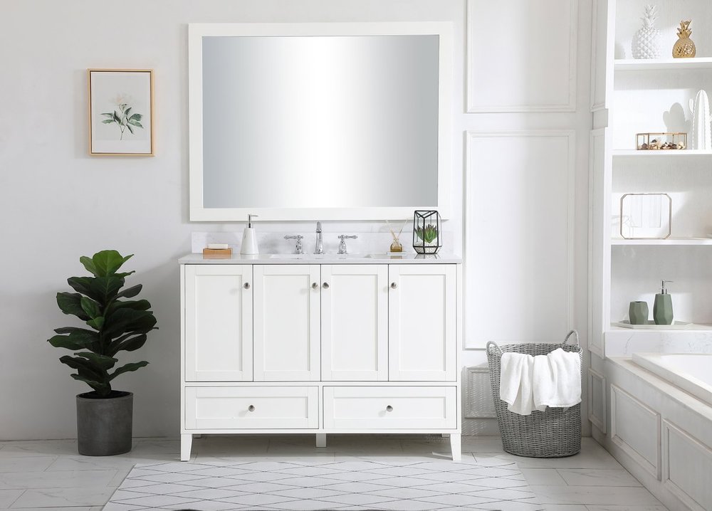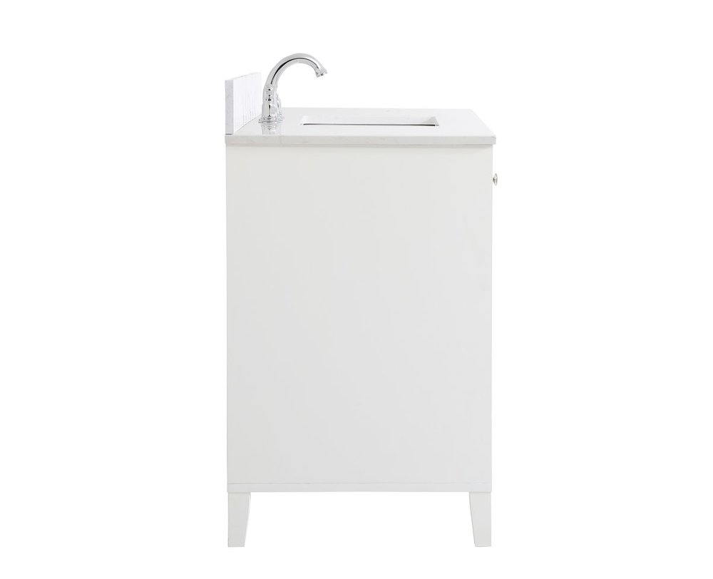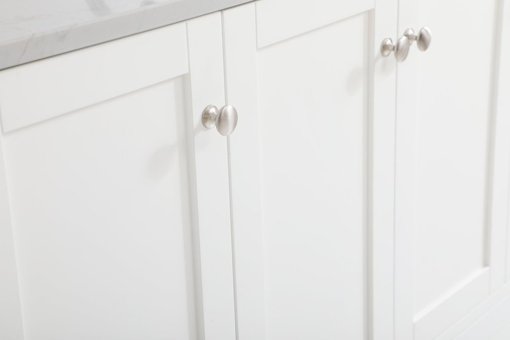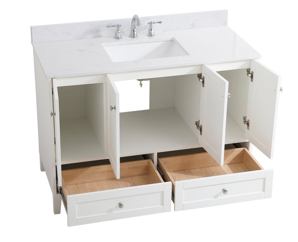 While unassuming, this 48" vanity in a white finish sure knows how to redefine luxury. The sleek brushed nickel knobs adorn the 4 cabinet doors and 2 bottom drawers which allow you to store your bathroom toiletries and necessities. Standing strong on oblique legs and dressed with a Calacatta engineered marble countertop, this vanity will surely create beauty and casual elegance in your bathroom or powder room. Comes with a matching backsplash to complete the look and protects your wall.