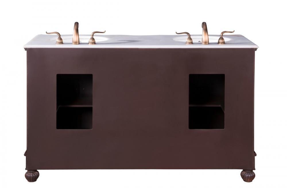 which compliments the handpainted teak finish cabinet oval white porcelain undermount sink, distinctively carved and turned solid wood bun feet, and antique bronze finish knobs, this rich and appealing vanity is a testament to refinement and style.