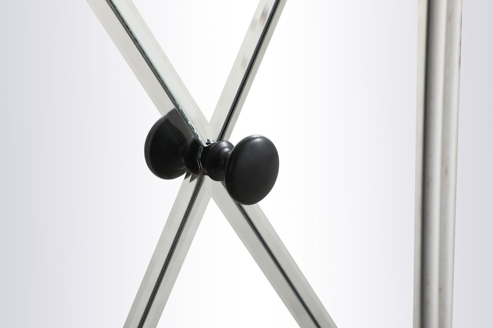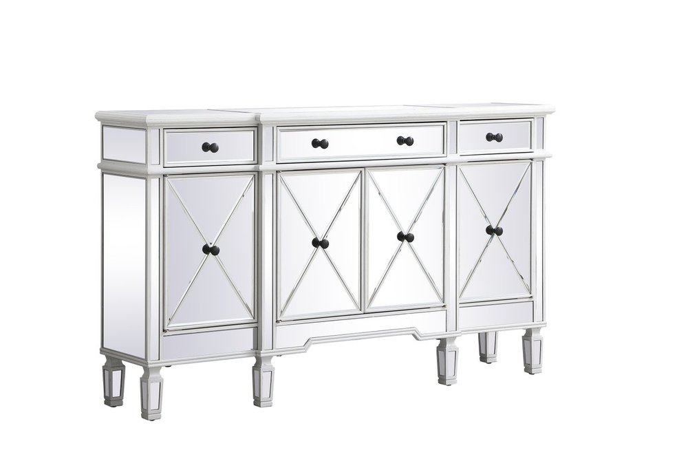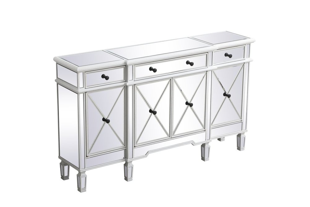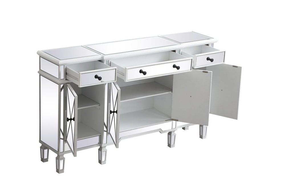 Make a striking statement with this gleaming mirrored credenza and live in the elegantly sleek future. Its contemporary style is defined by the alternating panels of polished beveled mirror panels. Its alternating panels that wrap around the entire cabinet creates an amusing design that everyone will enjoy and marvel at. Place this credenza in your home and adorn it with your favorite objects—captivating art pieces, beautiful floral arrangements, or even personal treasures like family portraits. Ships fully assembled with the exception of installing the legs.