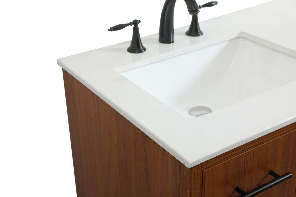 Delve into a world of minimalistic fashion and contemporary styling with this midcentury modern vanity. The clean lines anchors the design, while the straight tapered cylinder legs add subtle interest. Bar pull handle adorns the soft closing door hiding the base of the rectangular porcelain sink and letting you store your bathroom necessities and toiletries. Three soft closing drawers add plenty of storage option. Whether you want to use this as a floating vanity or a freestanding vanity, the choice is yours. The durable ivory white engineered marble countertop complements the manufactured wood base vanity and is built to last.