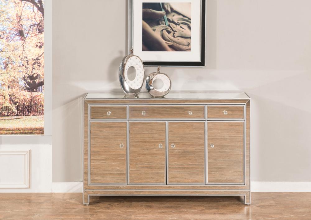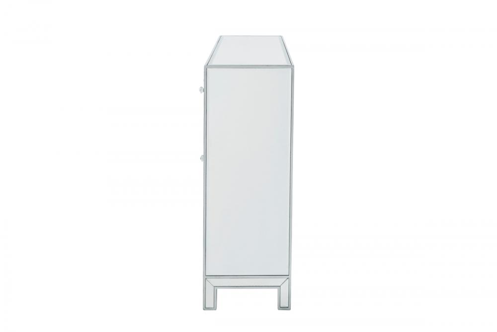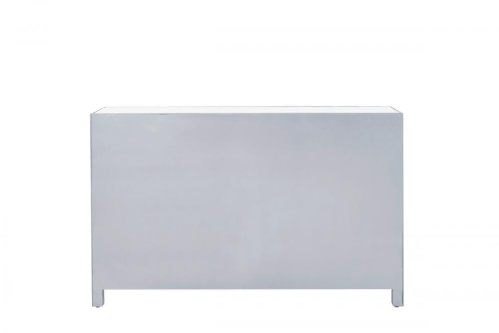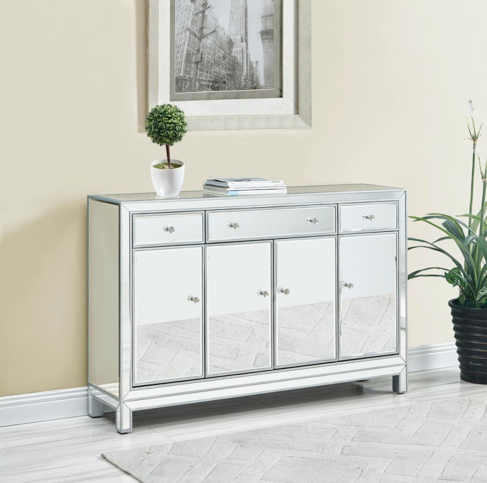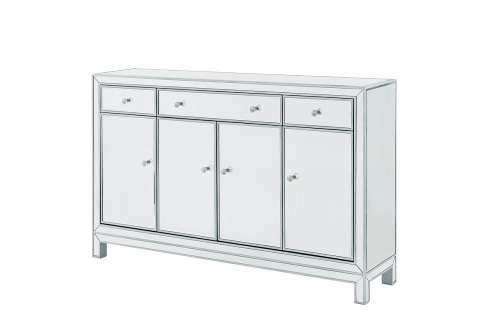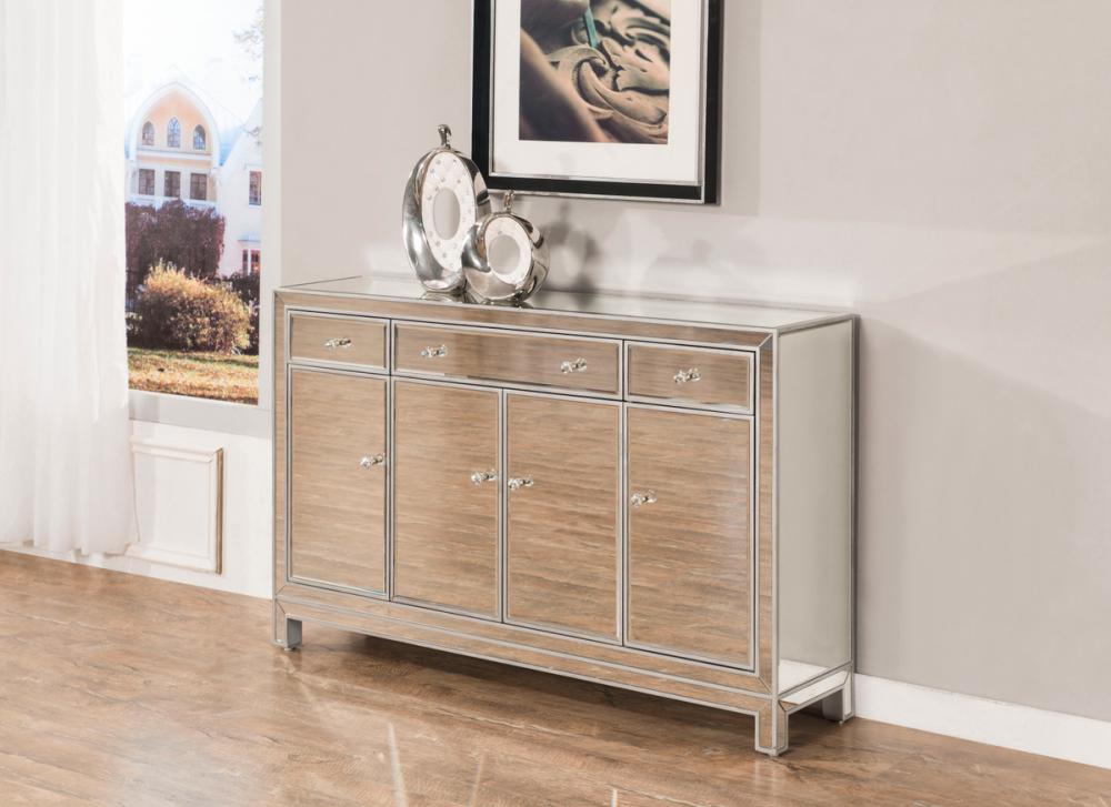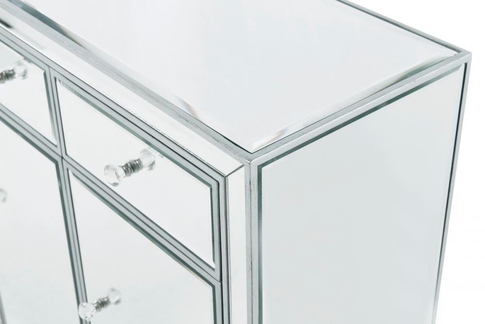 In bold symmetry, measuring W56xD13xH36”, this contemporary piece can decorate any narrow hallway or dinning room and still yield plenty of storage space. With the gleaming beveled mirror surfaces, it opens up the visual space in the room while imbuing it with glamour. The crystal door knobs exude sheer elegance. FEATURES: *Reflexion collection *3 drawers and 4 doors * crystal knobs *Hand paintedSilver finish *Beveled mirror panel *Solid wood trim and legs *Wood drawer glides *Inside lining painted in silver. PRODUCT DETAILS: Measurement W56xD13xH36” *No assembly required *Material in solid wood and engineered wood * 1 year limited warranty.