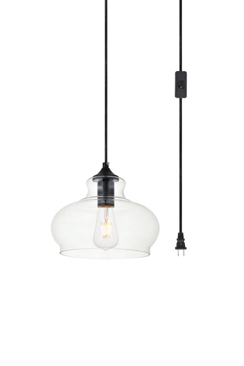 The small, but mighty Destry collection offers sleek pendant lamps that will add a powerful accent to your urban, industrial, or transitional décor. The light’s black hardware finish adds to the interest of the piece. Black 'top hat' design accentuates the clear glass shade. Each black and clear sugar pot shade holds one incandescent or LED light bulb (not included). Brighten your kitchen island, bathroom, entryway, or den with this one-light statement fixture. Plug-in design for easy access lighting with built-in on/off switch. Simply hang this piece on the provided swag hooks and plug it in for an effortlessly easy installation - can be hung from a sloped or vaulted ceiling.