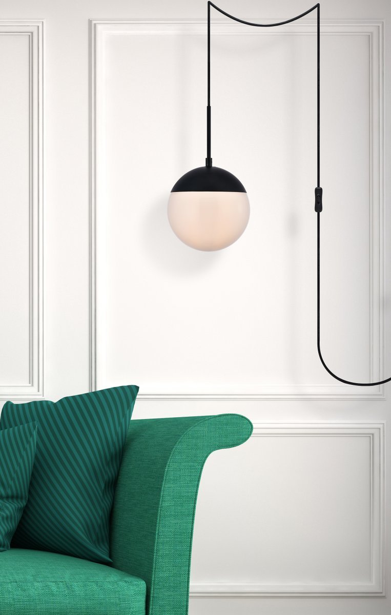 Refined style with a practical design, Eclipse plug in pendant lamps bring cosmopolitan sophistication anywhere, especially to an entryway, office, bathroom, bedroom, or kitchen. The smooth iron round frame comes in a black finish. A 15 foot black cord allows you to vary the hanging height off the swag hooks. Since this is a plug-in you can move it around easily to add light wherever you go. A touch of color on top of the frosted white spherical glass shade brings character to this classic style. Living in the big city has never been this easy. Simply hang this piece on the provided swag hooks and plug it in for an effortlessly easy installation - can be hung from a sloped or vaulted ceiling.