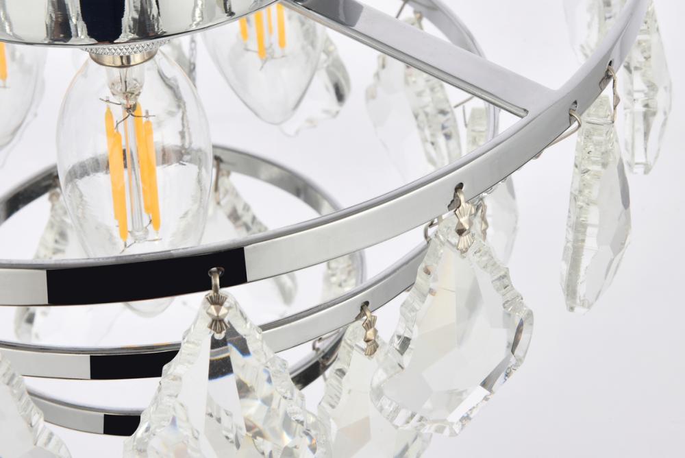 Tiers of clear multi-faceted crystals reflect the soft glow of candelabra bulbs