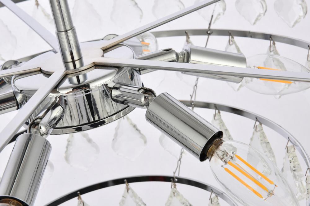 Tiers of clear multi-faceted crystals reflect the soft glow of candelabra bulbs