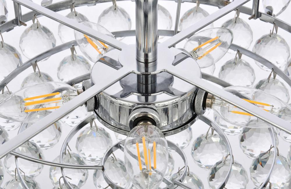 Tiers of clear multi-faceted crystals reflect the soft glow of candelabra bulbs