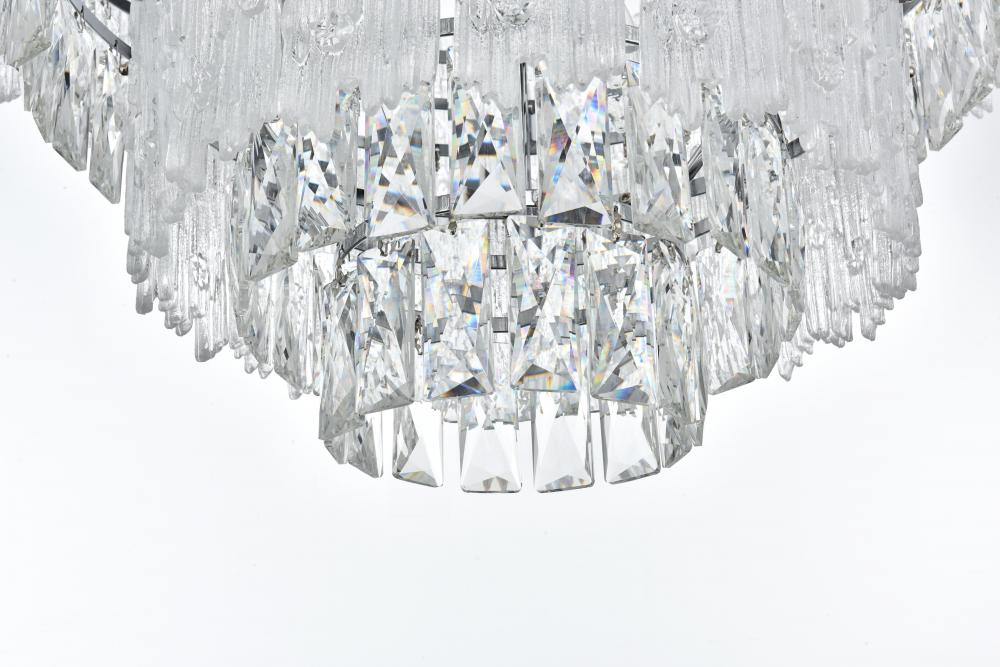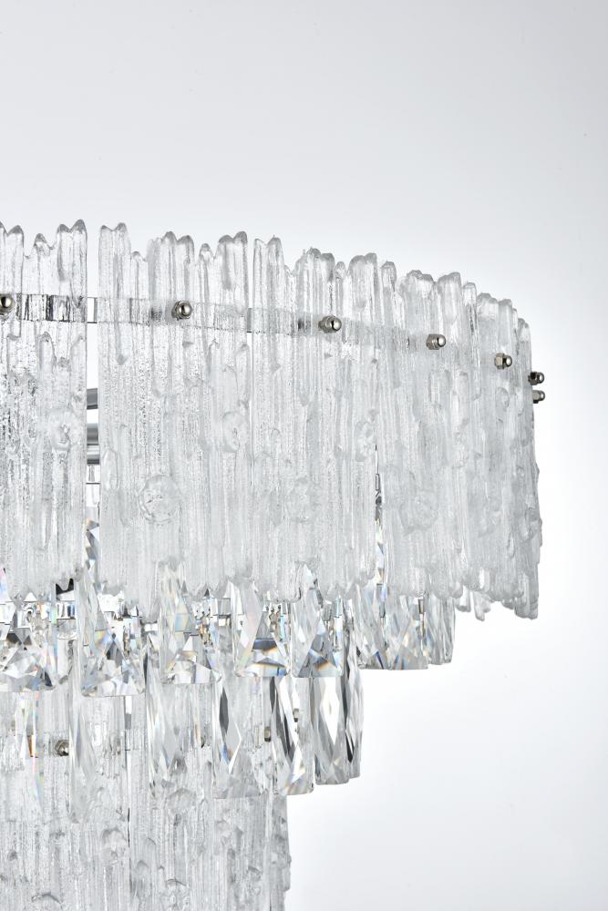 The combination of clear crystals and textured glass creates a sophisticated light play, perfect for setting an elegant mood.