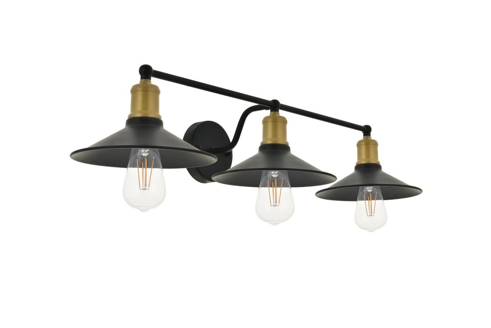 Two-toned brass and black finish 3-light wall sconce with a curved arm and cone shaped shade