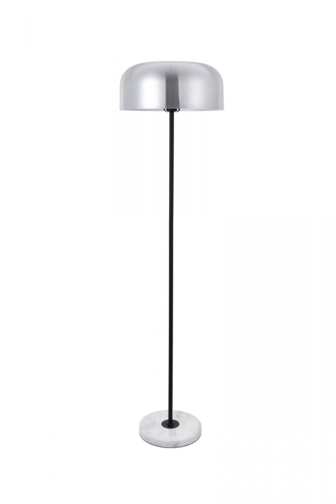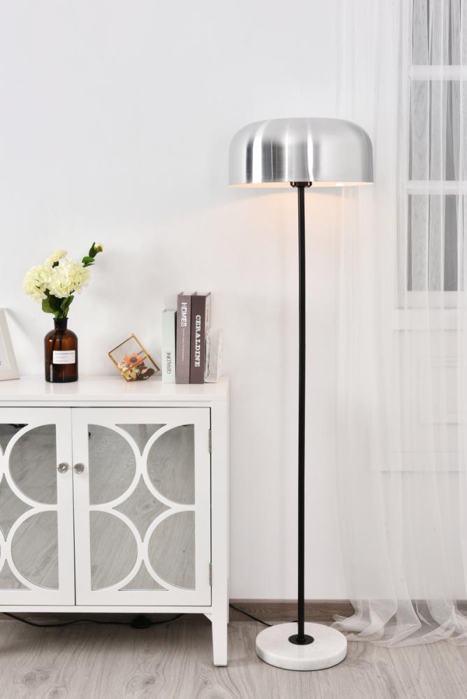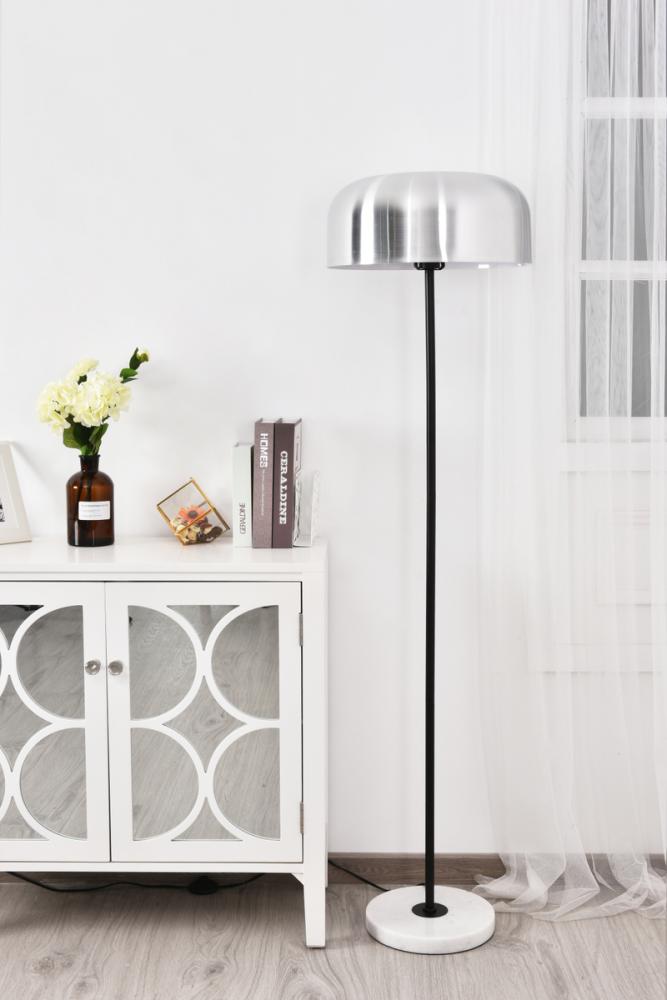 Contemporary brushed nickel finish floor lamp with a dome shape shade, slender body, and white carrera marble base
