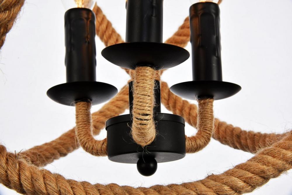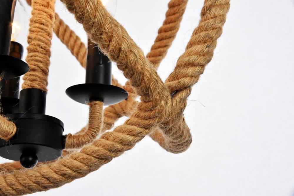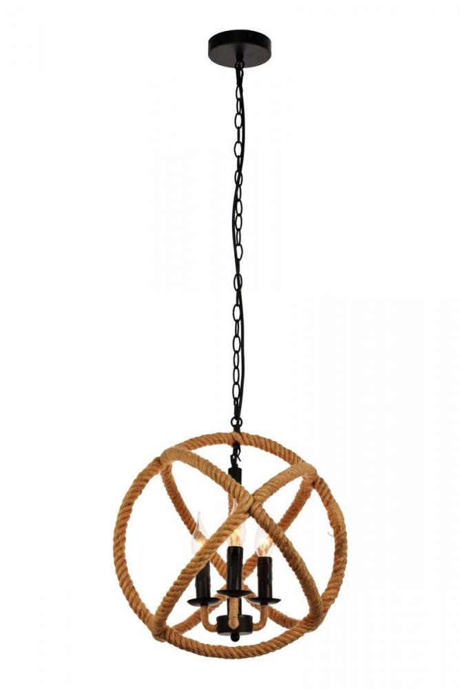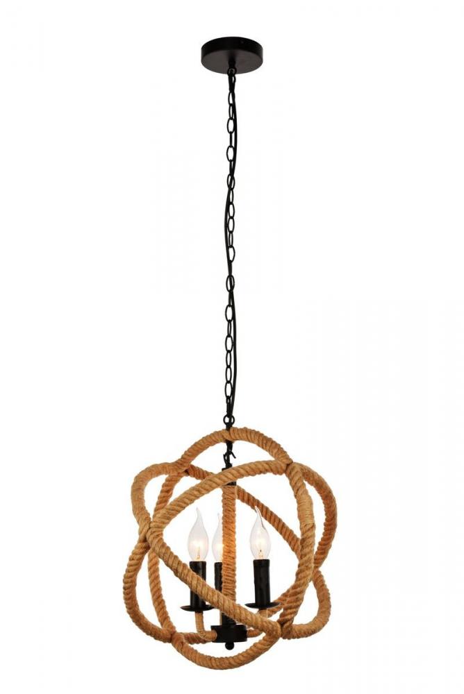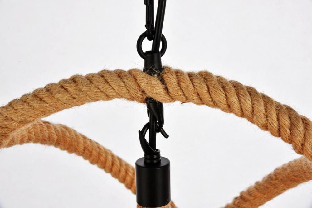 Minimal, but with a sense of postmodern humor, Gerrit collection hanging fixtures will be a charming novelty in a kitchen, entryway, office, or above a bar. An unconventional gyroscope-style frame features three connected rings wrapped in coarse rope that lend the design both personality and texture. Three candle-like exposed bulbs gleam at the center, adding a dash of vintage charm. This fixture can accommodate either incandescent or LED bulbs (not included). The brown and black finish of the cord, socket, and mounting fixture contrast the rope trim nicely.