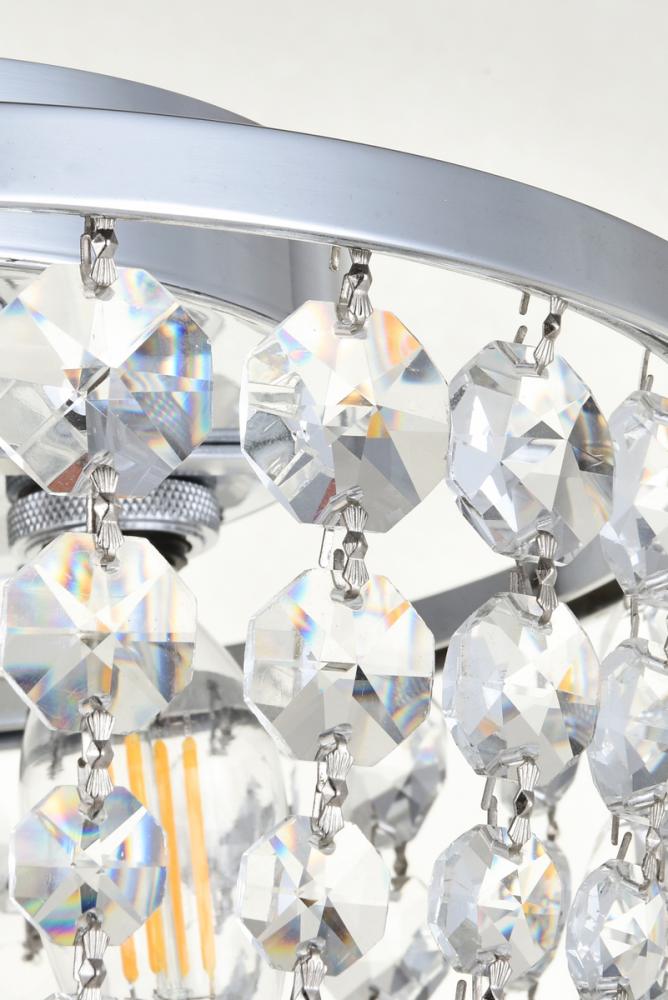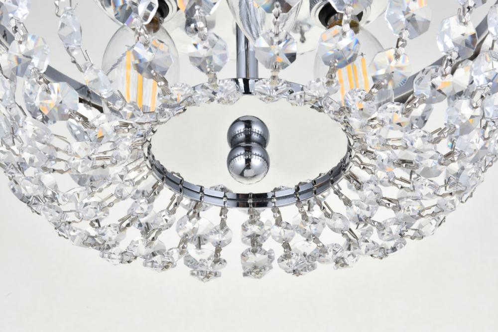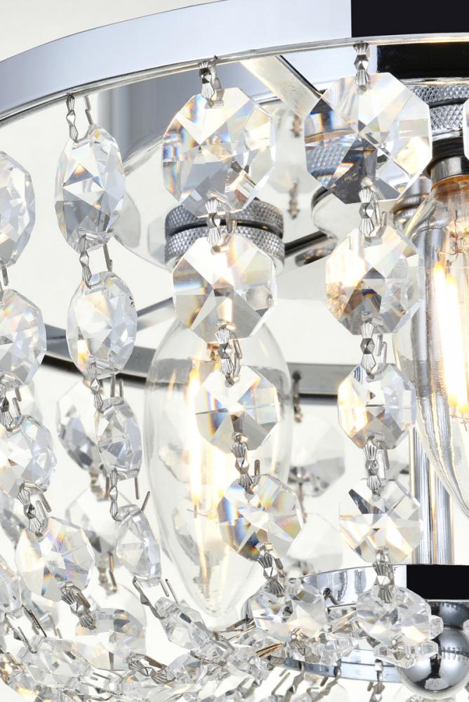 Tiers of clear multi-faceted crystals reflect the soft glow of candelabra bulbs