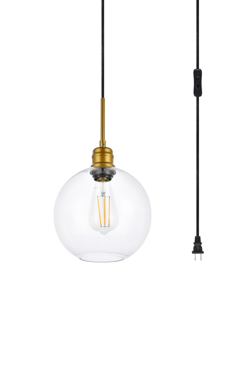 Clean lines and modern whimsy--that's the Emett Collection of plug in pendant lamps. Its Single light makes it perfect for any small apartment or room space, but its also a perfect addition to any larger rooms that requires illumination, such as a dining room or living room. Available in a black or brass finish with a round clear glass shade, it won't be too hard to fit this versatile lighting fixture in your home (light bulbs not included). Comes with a 15 foot cord with an in-line on and off switch. Also includes two swag hooks. Simply hang this piece on the provided swag hooks and plug it in for an effortlessly easy installation - can be hung from a sloped or vaulted ceiling.