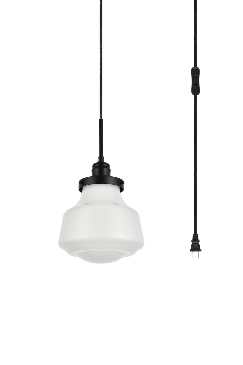 The Lyle Collection is a stunningly functional, yet simplistically lovely light. The geometric shade creates a clean form that will fit well in any space, large or small. Its versatile simplicity allows for this fixture to blend in well with the rest of your room, while still maintaining its own bright personality. Hanging from a 15 foot plug in black cord, it'll always be the perfect height for your dining room table or study space. Available in a black or brass finish, and a clear bubble or frosted white shade, let this pendant lamp illuminate your room (light bulbs not included). Simply hang this piece on the provided swag hooks and plug it in for an effortlessly easy installation - can be hung from a sloped or vaulted ceiling.
