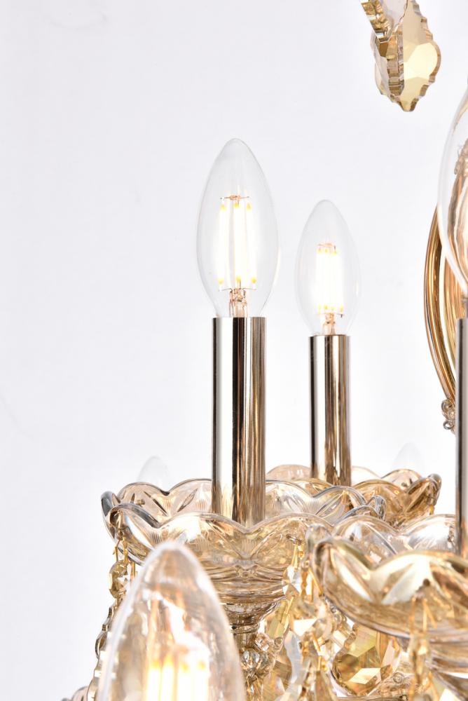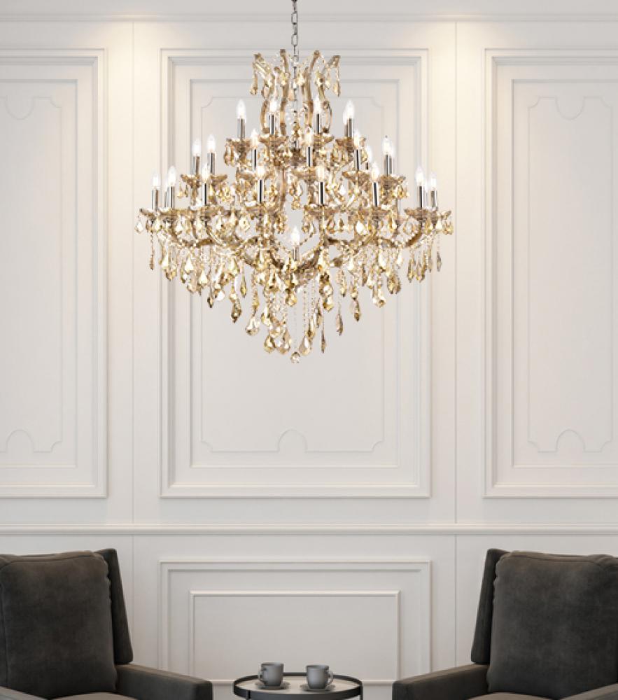 A heavenly high point to your home, Maria Theresa collection pendant lamps are ablaze with hundreds of resplendent crystals. Copious strands of sparkling clear or golden-teak crystals dangle from elaborate tiers of glass-coated steel arms in your choice of a chrome, gold, golden-teak, white, or black finish. An imperial favorite for the stairwell, dining room, or living room.