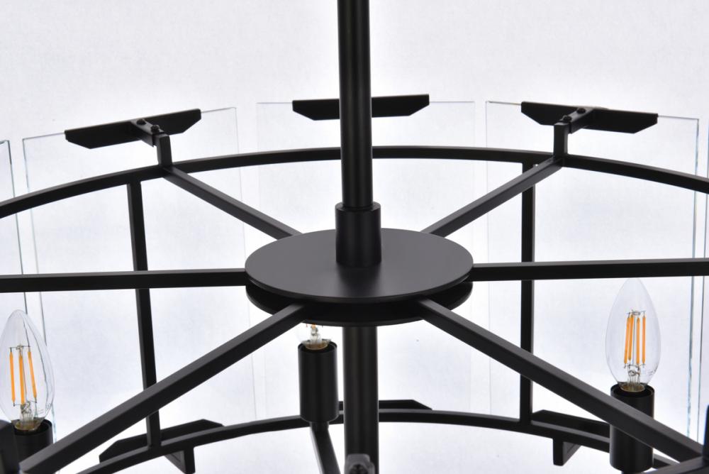 Lamp features a diameter of 26 inches, a height of 12 inches, a minimum hanging length of 18 inches, a maximum hanging length of 72 inches, and requires 6 candelabra bulbs