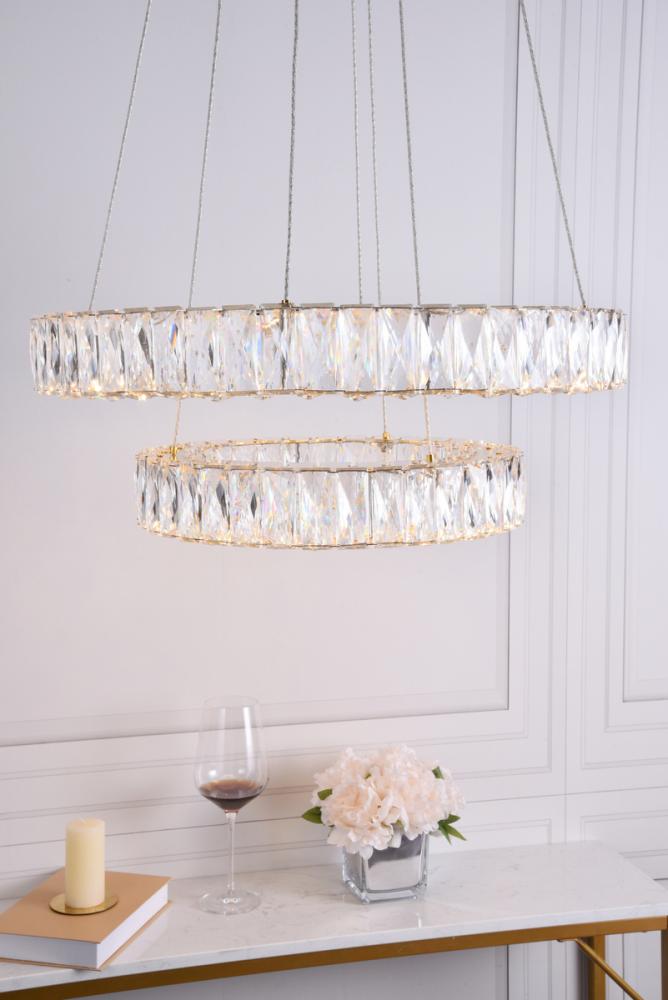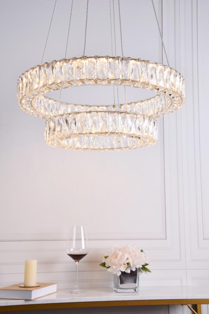 Diamonds are a girl’s best friend, and sparkling Monroe collection hanging fixtures take Marilyn’s famous lines to heart … for women and men alike. A minimal stainless-steel frame in a smooth gold finish becomes dazzling when it is covered entirely with rectangular and square spectacularly faceted royal-cut clear crystals. The oblong design hangs from almost invisible wires with brilliant integrated LED shining unseen from within. Stunning when placed in a dining room, kitchen, living room, or bedroom.