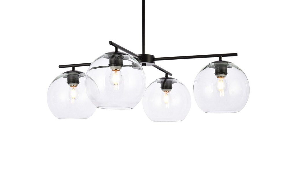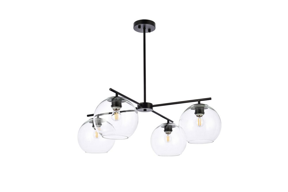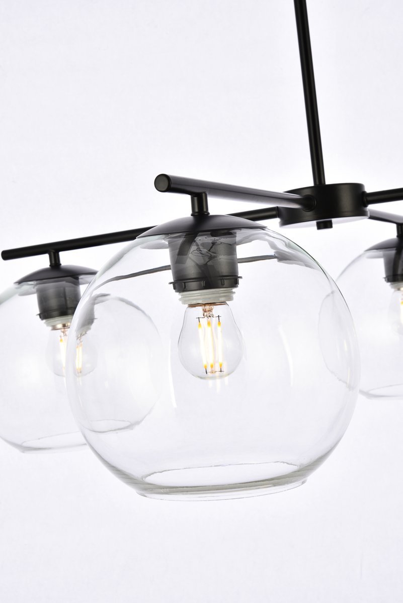 Features a round canopy, an adjustable hanging rod, and clear glass globe shades