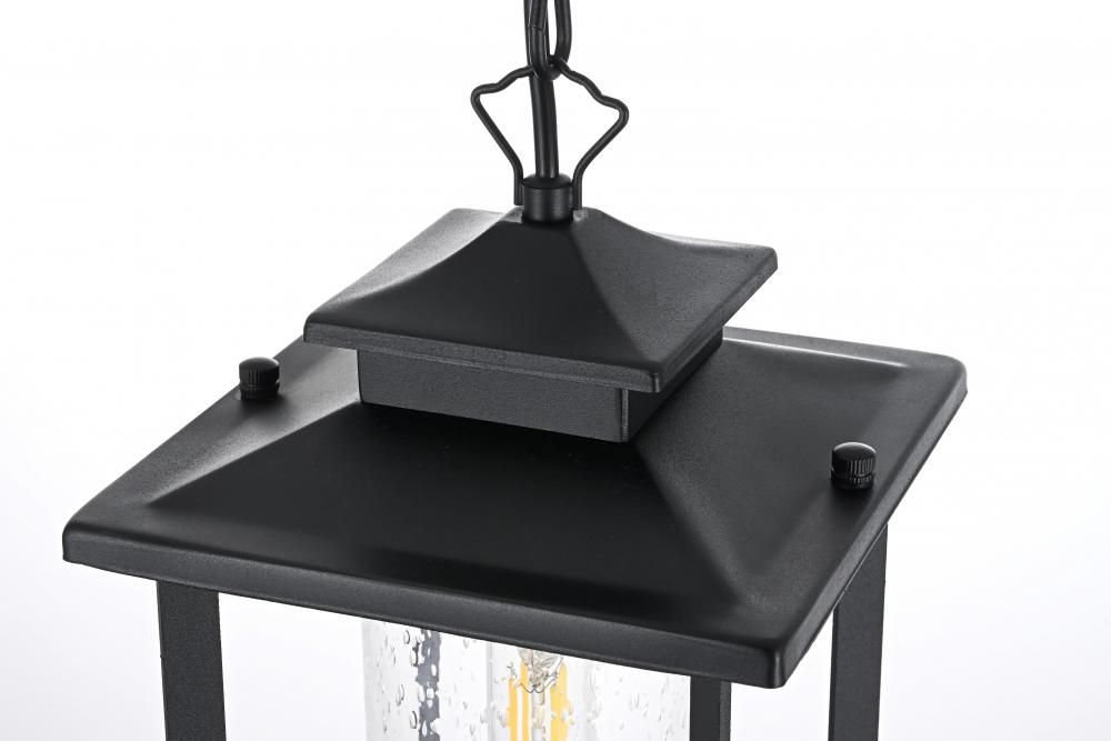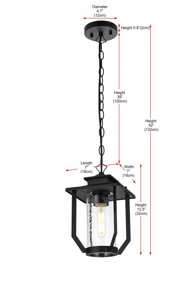 Elevate your outdoor decor with this stunning geometric outdoor pendant light. Featuring a unique open-frame design with sleek angular arms and a clear seeded glass shade, this pendant offers a striking mix of modern and classic aesthetics. The matte black finish gives it a versatile charm, fitting well with any style of exterior decor—from contemporary to rustic. The clear seeded glass adds texture and beauty, creating a soft, warm light that enhances your porch, patio, or entryway. Built with durable, weather-resistant metal and certified for wet locations, this pendant light is both stylish and built to last. The adjustable chain offers flexibility in hanging height, making it perfect for various outdoor settings. Illuminate your exterior spaces with elegance and charm, and create a welcoming atmosphere for guests and family alike.