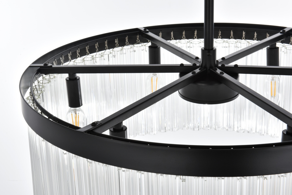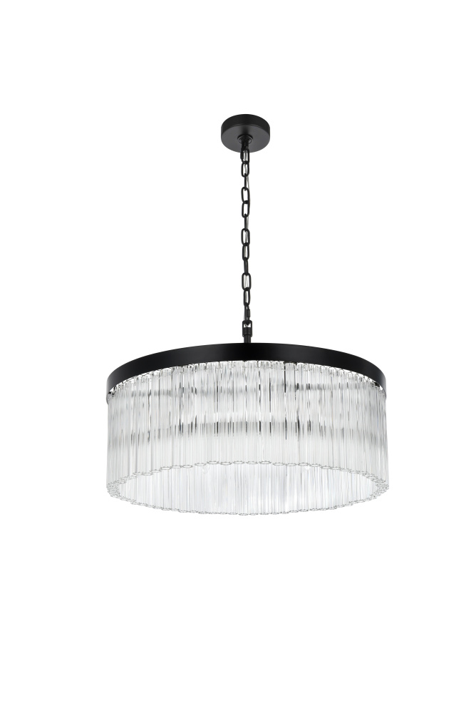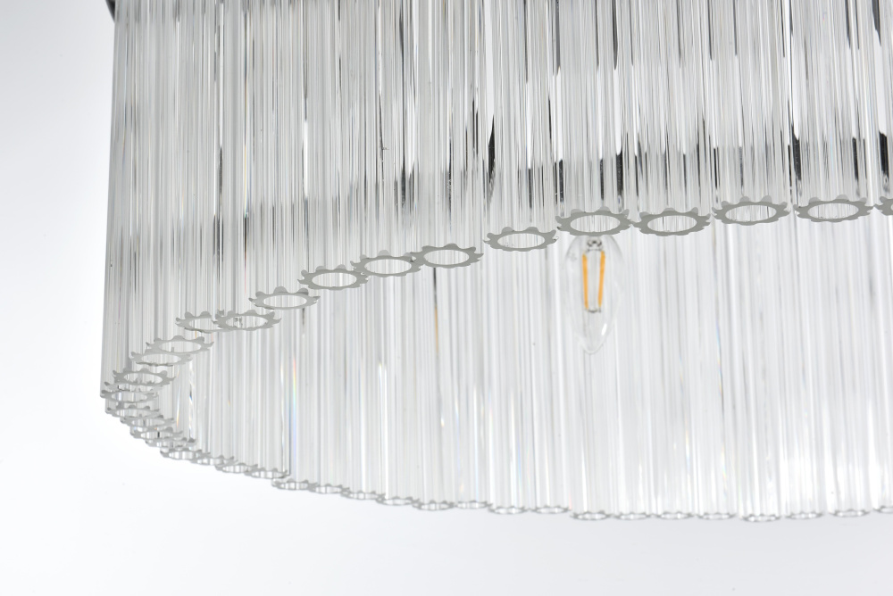 Turn your space into a glowing masterpiece with this striking pendant light, crafted from durable iron and shimmering clear ribbed glass. The cascading layers create a stunning interplay of light and shadow, refracting illumination into a radiant display that transforms your space into an illuminated work of art. Available in chrome for a sleek, contemporary aesthetic, black for bold contrast, and satin gold for an inviting warmth, this pendant light is as versatile as it is beautiful. Whether you choose a single tier for minimalist charm, two tiers for balanced depth, three tiers for bold presence, or four tiers for show-stopping grandeur, there’s an option for every setting. Featuring both round and rectangular frame designs, this fixture adapts to any space with ease. Complete with a matching canopy and chain, and fully dimmable for customized lighting, this pendant pairs perfectly with the coordinating single-tier flush mount and wall sconce collection, ensuring a cohesive, radiant design throughout youhome or office. Please note: light bulbs are sold separately.