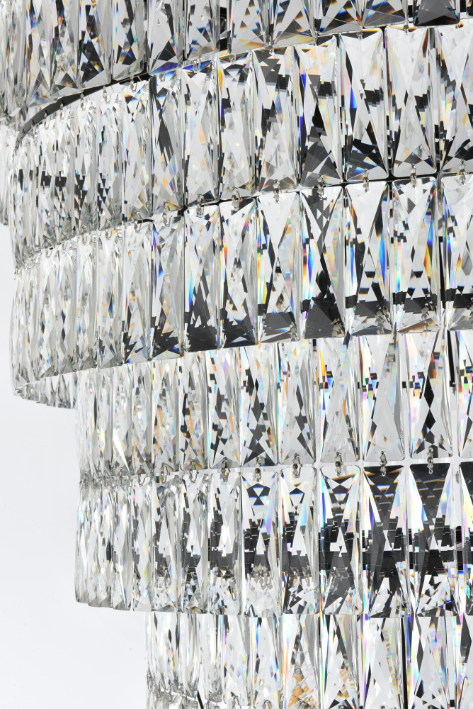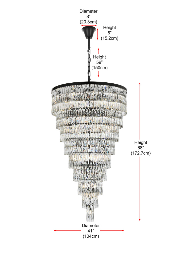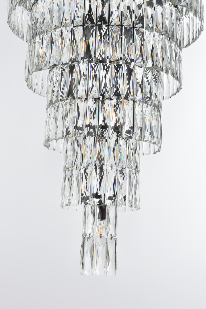 Transform your space with this extraordinary pendant that reimagines classical crystal design for contemporary interiors. The masterfully engineered silhouette features nine graduating tiers that create a spectacular inverted pyramid, reminiscent of a frozen cascade captured in mid-descent. Each precisely cut rectangular crystal is strategically positioned to maximize light play, creating mesmerizing displays of fractured light throughout your space. The substantial scale makes this fixture an ideal centerpiece for grand entryways, sophisticated dining rooms, or executive offices. The thoughtful construction incorporates 61 light sources distributed throughout the tiers, ensuring both spectacular illumination and enchanting crystal animation. The robust iron framework provides a secure foundation while maintaining visual lightness, allowing the crystals to appear as if floating in space. Available in reflective chrome, sophisticated black, or warm satin gold, this pendant makes an unforgettable statement while maintaining refined restraint. The cascading arrangement creates a sense of movement and flow, while the geometric precision of each crystal adds contemporary edge to the classical form. This is more than a light fixture – it's an architectural feature that transforms your space through its commanding presence and spectacular light performanc