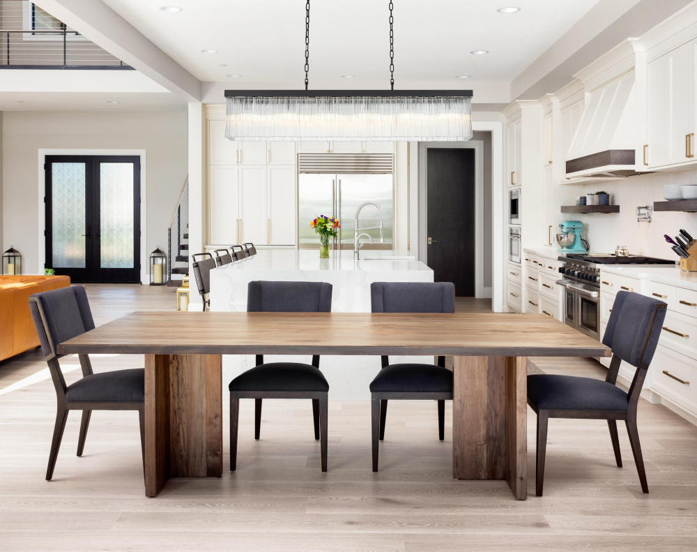 The rectangular frame adds geometric refinement, ideal for linear dining tables or elongated spaces.