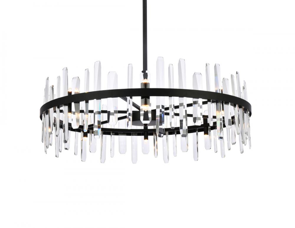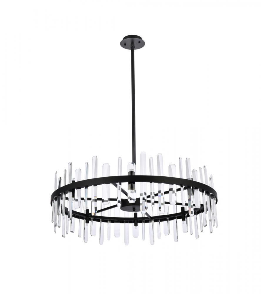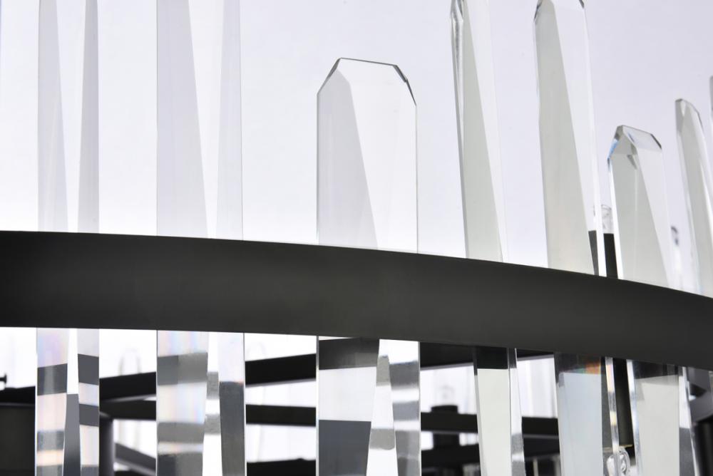 Modern crystal chandelier features top and bottom tier crystal prisms staggered along the wrought iron frame. The thick metal frame wraps around top grade crystal prisms ensure it is built to last, definitely worth it. Hang this work of art and dim the lights for a bit of sophisticated lighting in your home. Get lost in a beautiful light and sleek design available in multiple finishes. The hanging rod conveniently comes with a slope ceiling adapter, perfect for your vaulted or angled ceiling.
