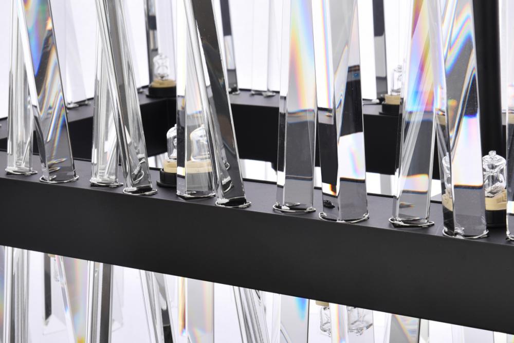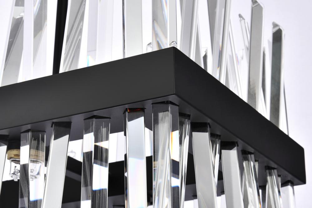 Modern crystal chandelier features top and bottom tier crystal prisms staggered along the wrought iron frame. The thick metal frame wraps around top grade crystal prisms ensure it is built to last, definitely worth it. Hang this work of art and dim the lights for a bit of sophisticated lighting in your home. Get lost in a beautiful light and sleek design available in multiple finishes. The hanging rod conveniently comes with a slope ceiling adapter, perfect for your vaulted or angled ceiling.
