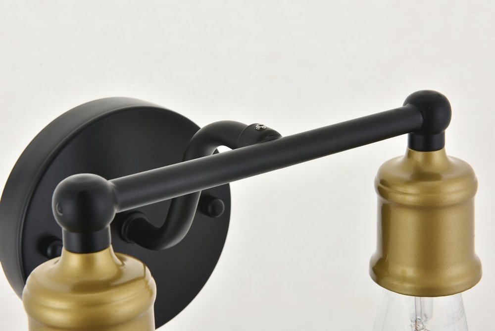 Two-toned brass and black finish 2-light wall sconce with an undulating arm and circular back plate