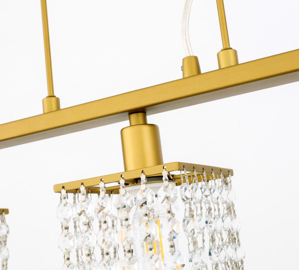 Elegant brass finish 3-light rectangular pendant with hanging strands of glimmering crystals; suspended from a rectangular canopy