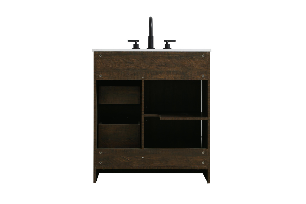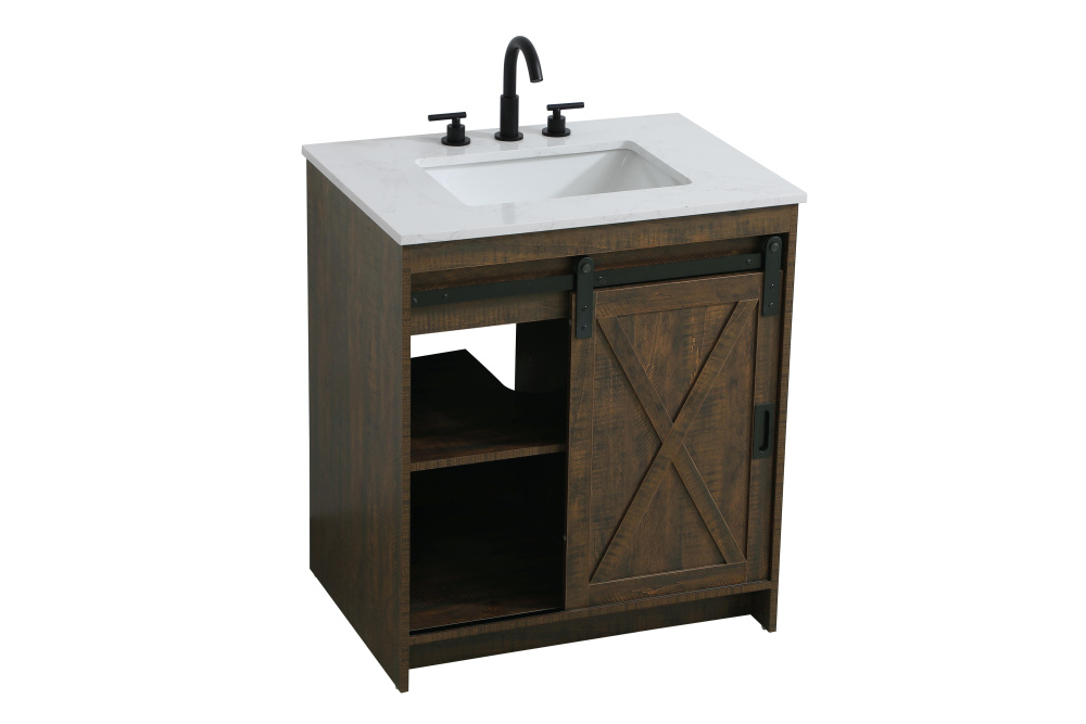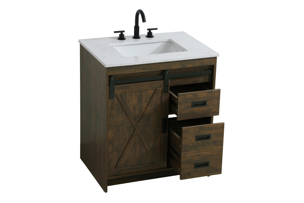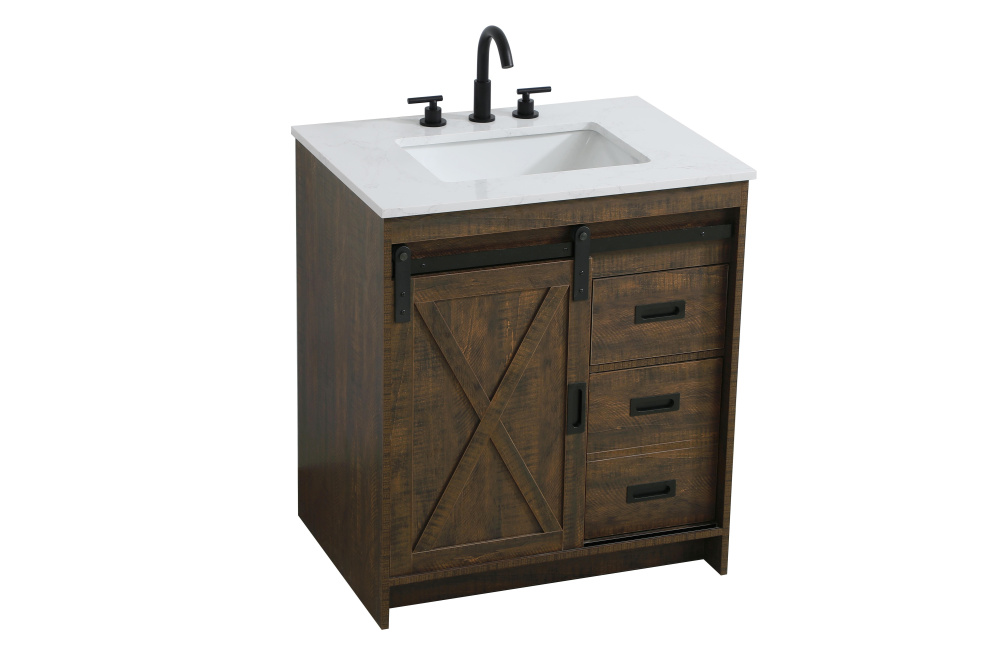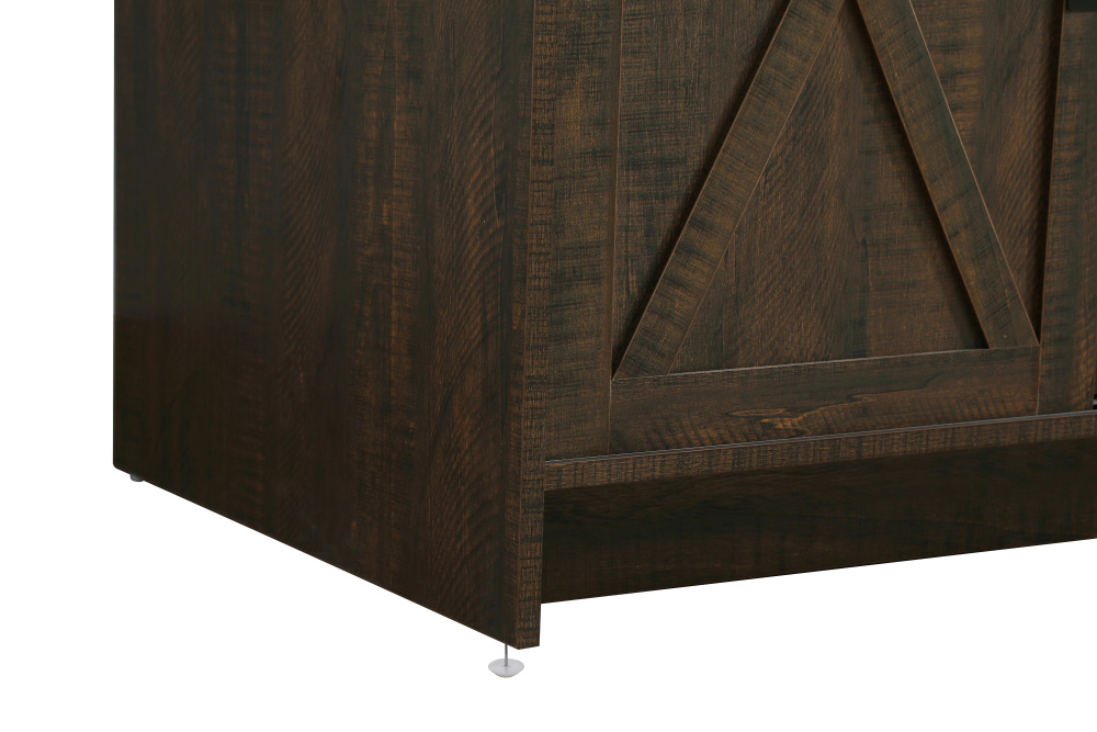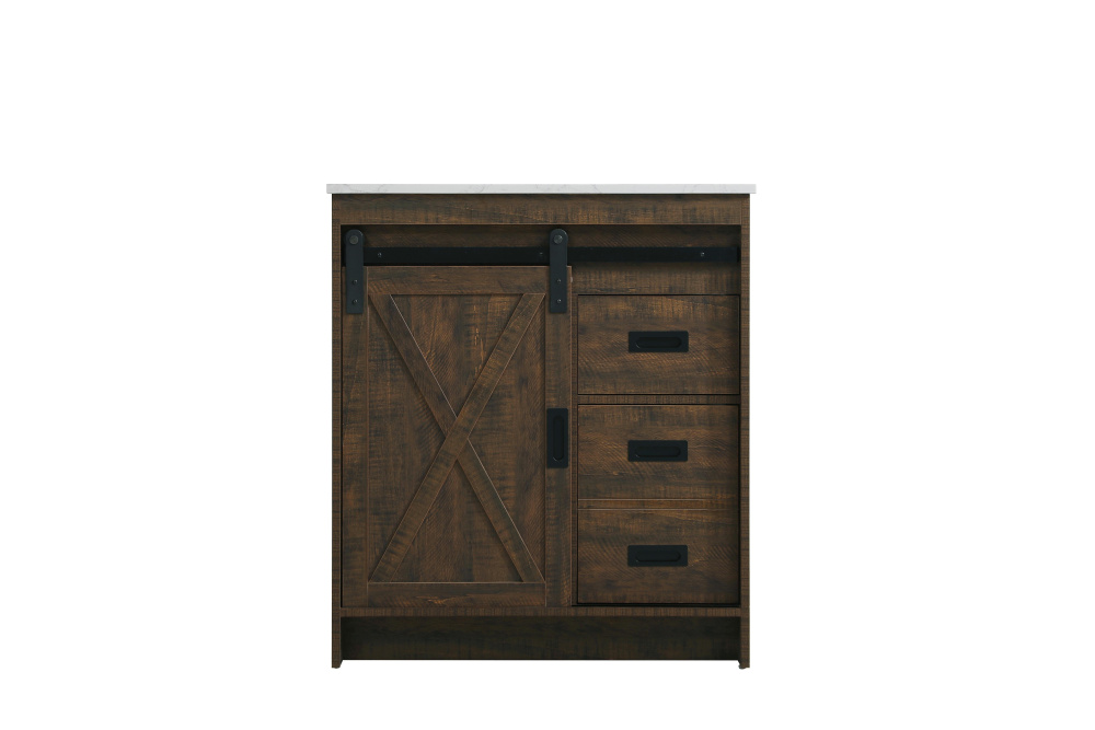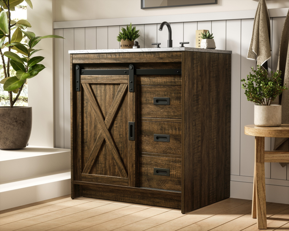 Transform your bathroom with this rustic barnyard-style vanity, designed to balance aesthetic appeal and functionality. Featuring a sliding barn door with black metal hardware and complementary handle pulls, this piece blends rugged charm with practical design. The engineered marble countertop displays unique marbling, while the porcelain undermount sink offers easy maintenance and durability. Available in Espresso, Natural Oak, and Rustic Grey finishes, this vanity suits a range of styles. It includes a deep storage drawer for larger items, a hidden shelf for towels or décor, and adjustable foot levelers for added stability on uneven floors. With pre-drilled faucet holes for easy setup, this vanity delivers style and substance to enhance your bathroom.