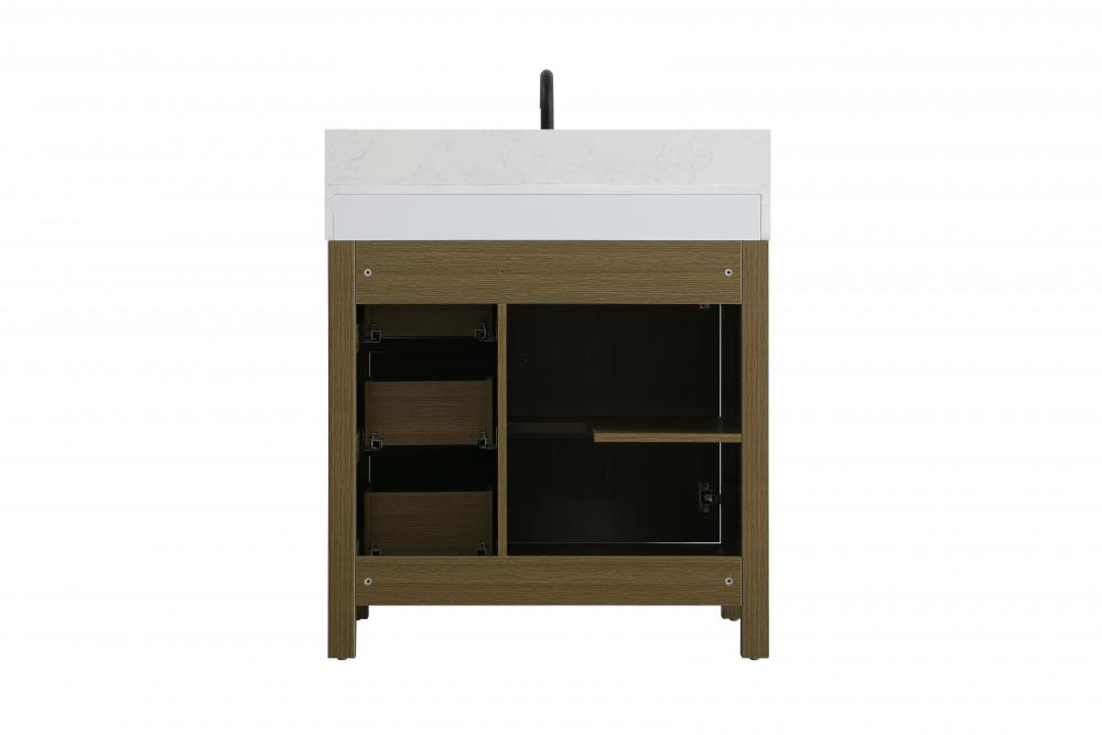 This bathroom vanity embodies a clean, minimalist design, perfectly suited for modern and transitional spaces. Its straight, sleek lines and flat-paneled doors create a refined yet approachable look. The warm, honey-toned finish highlights the subtle faux wood grain, adding visual interest while maintaining a sense of balance and simplicity. The sturdy rectangular frame, combined with the thick engineered marble countertop, makes a bold and harmonious statement, providing an understated luxury without being overly ornate. The vanity features a functional layout, with two cabinet doors on one side and three stacked drawers on the other, creating a balanced and organized look. Matte black hardware, including slim and cylindrical pulls, contrasts elegantly against the warm wood, reinforcing its contemporary vibe while providing subtle visual interest. The thick engineered marble countertop in crisp white adds a sharp contrast to the warm base, creating a visually dynamic combination that is both functional and stylish. This vanity is perfect for those seeking a design that combines modern simplicity with a touch of bold refinement. This vanity is delivered fully assembled and equipped with foot levelers for effortless installation and stability. Combining practicality and bold design, this vanity is UPC certified and ready to transform your bathroom space. The matching backsplash seamlessly integrates with the countertop, offering a cohesive design that protects walls from splashes while maintaining a unified look.