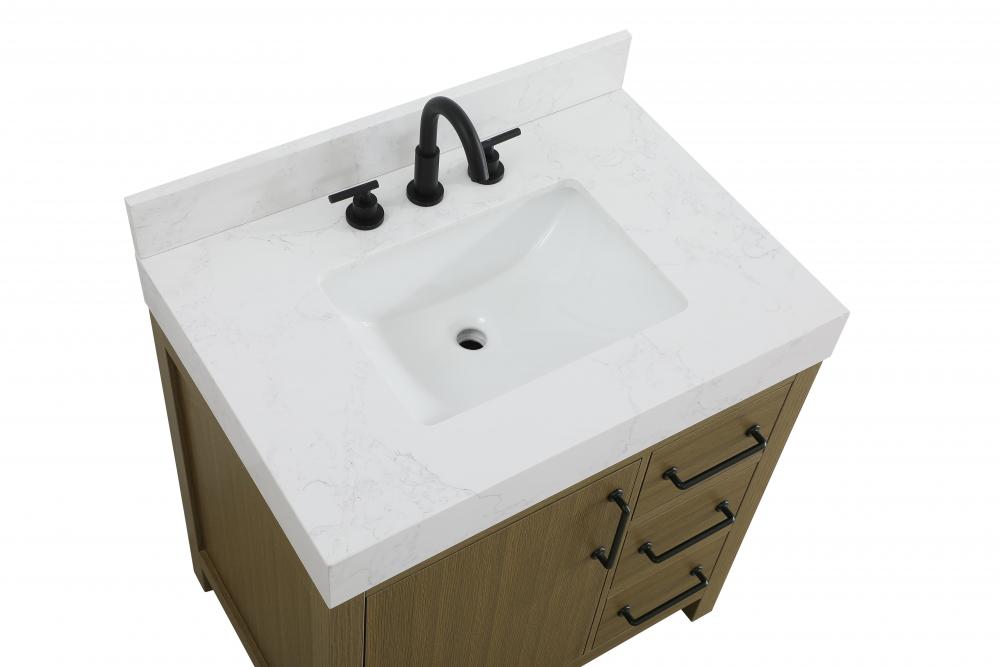 The engineered marble countertop stands out with its bold 4-inch thickness and natural veining, creating a commanding presence in any bathroom.