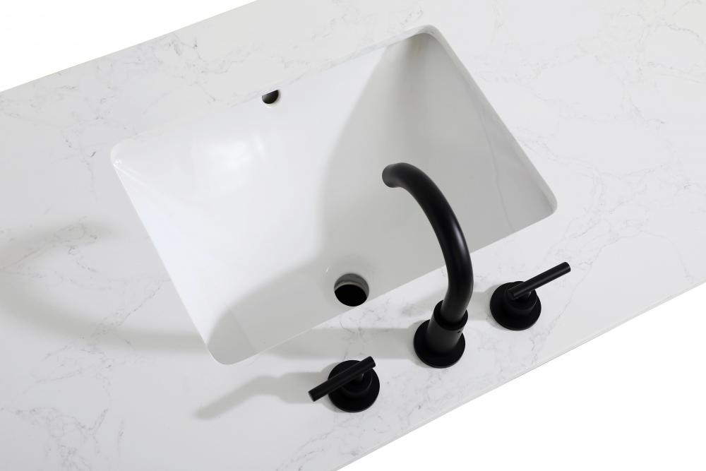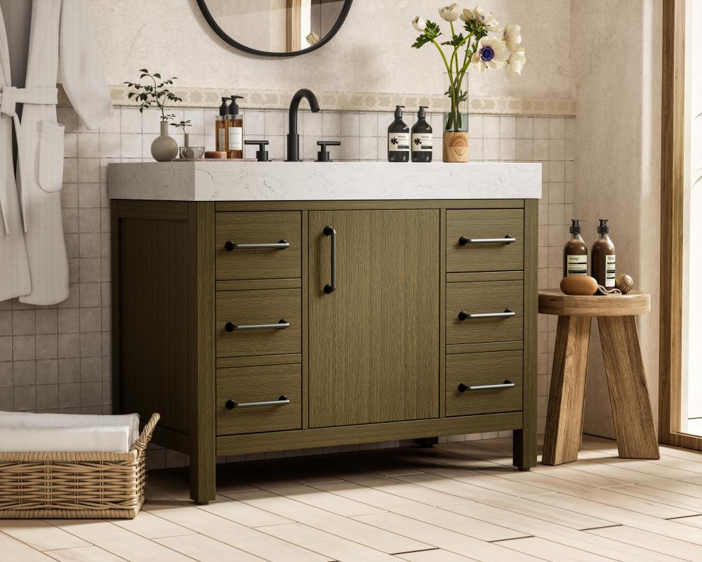 The engineered marble countertop stands out with its bold 4-inch thickness and natural veining, creating a commanding presence in any bathroom.