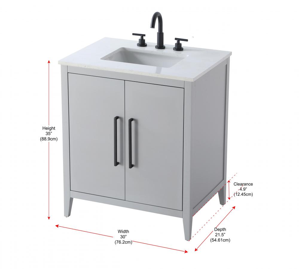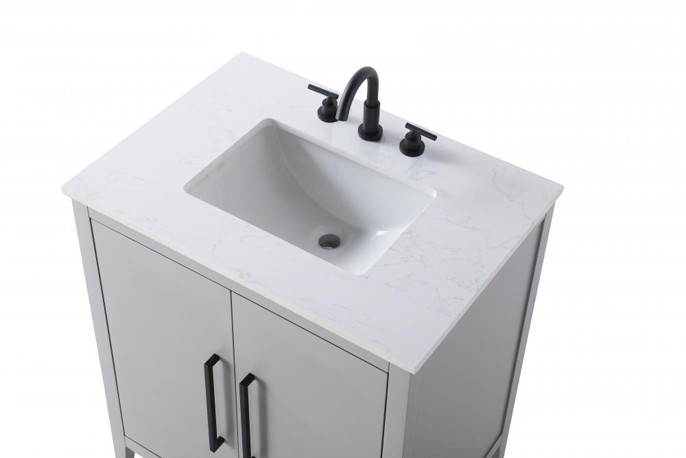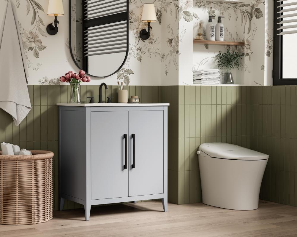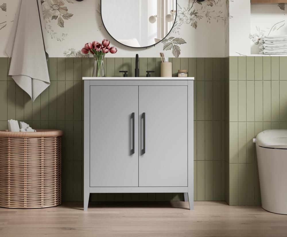 Bring both elegance and practicality to your bathroom with this transitional vanity, available in a selection of rich finishes that highlight the beauty of faux wood grain in shades of mocha, chestnut, and honey, along with classic white and modern grey. The flat door panels and sleek black metal pulls create a minimalist yet refined aesthetic, while the soft-closing drawers and tapered legs with levelers provide smooth, functional operation. Topped with a luxurious white engineered marble countertop and featuring a porcelain sink, this vanity combines timeless style with modern efficiency. Thoughtfully designed with U-shaped cutout for plumbing, it offers ample storage and easy installation, making it the perfect centerpiece for any bathroom.