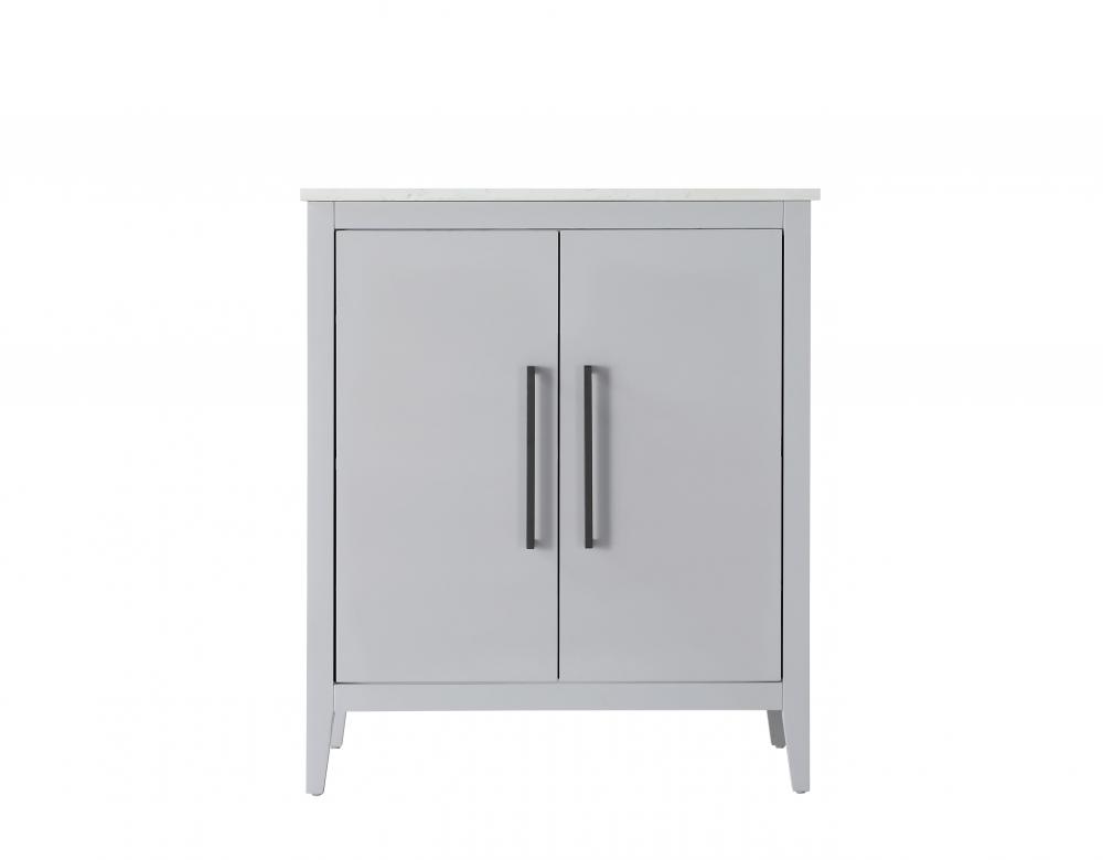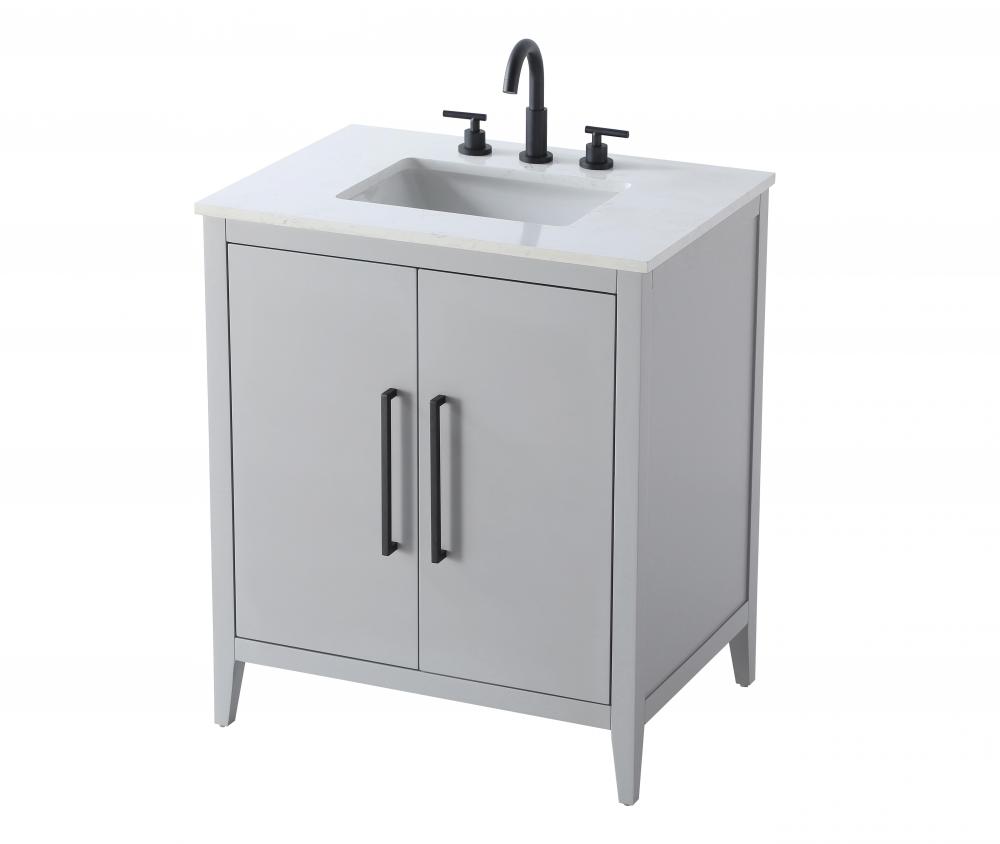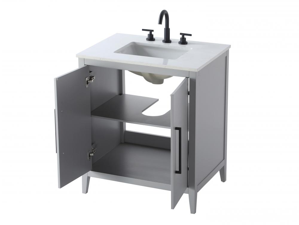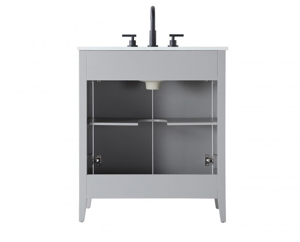 Bring both elegance and practicality to your bathroom with this transitional vanity, available in a selection of rich finishes that highlight the beauty of faux wood grain in shades of mocha, chestnut, and honey, along with classic white and modern grey. The flat door panels and sleek black metal pulls create a minimalist yet refined aesthetic, while the soft-closing drawers and tapered legs with levelers provide smooth, functional operation. Topped with a luxurious white engineered marble countertop and featuring a porcelain sink, this vanity combines timeless style with modern efficiency. Thoughtfully designed with U-shaped cutout for plumbing, it offers ample storage and easy installation, making it the perfect centerpiece for any bathroom.