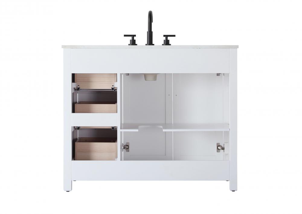 The slender black metal handle pulls on the doors and drawers offer a sleek, modern contrast to the white finish, adding to the vanity's sophisticated look.