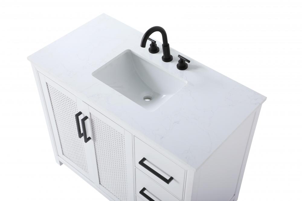 The countertop, made from white engineered marble, features subtle veining for a luxurious yet durable surface that’s easy to clean and maintain.